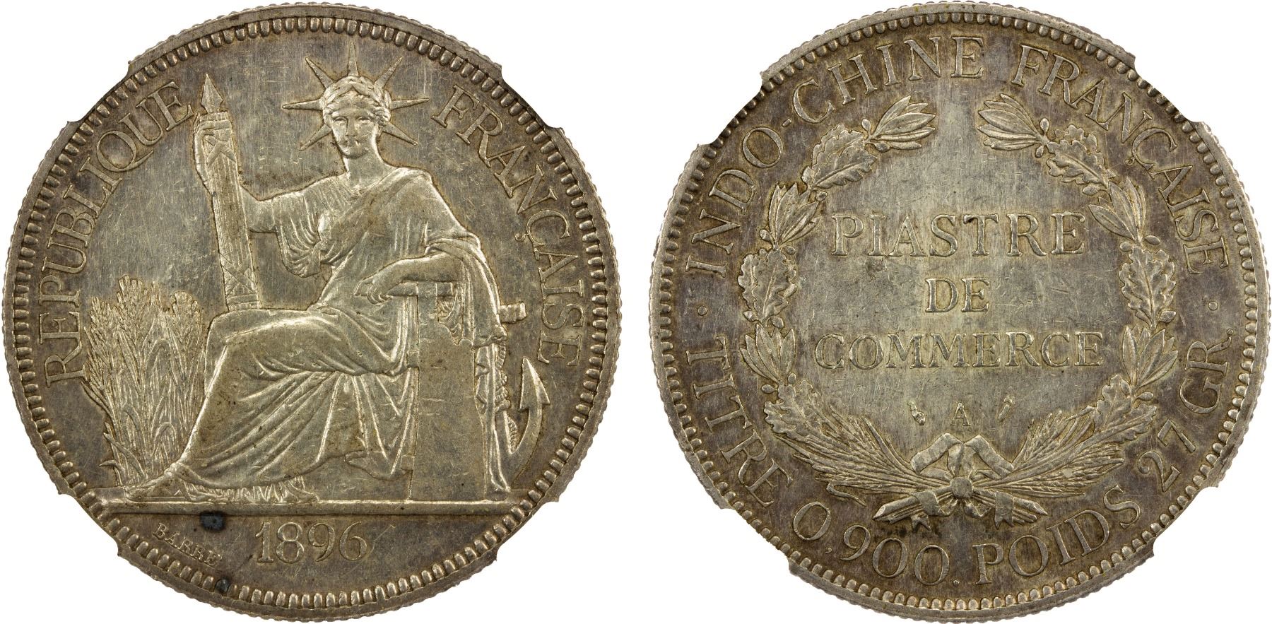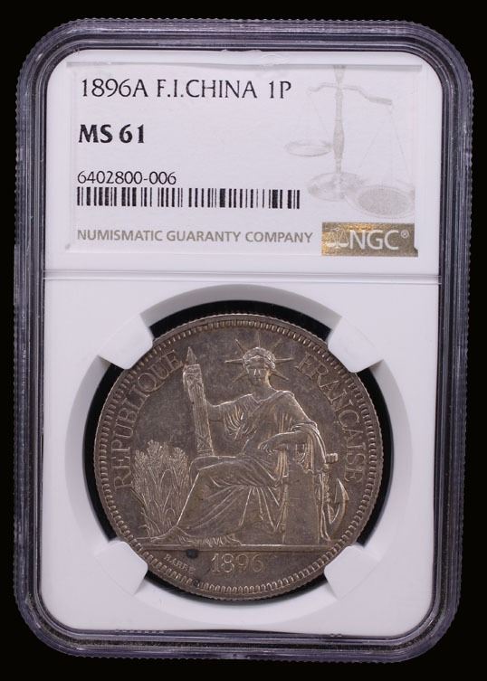 FRENCH INDOCHINA: French Colony, AR piastre, Paris, 1896-A, KM-5a.1, Daniel-7c, lightly toned, NGC graded MS61.