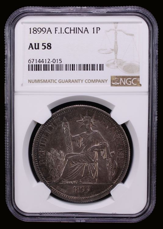 FRENCH INDOCHINA: French Colony, AR piastre, Paris, 1899-A, KM-5a.1, dark blotch on reverse, toned, better date, NGC graded AU58.