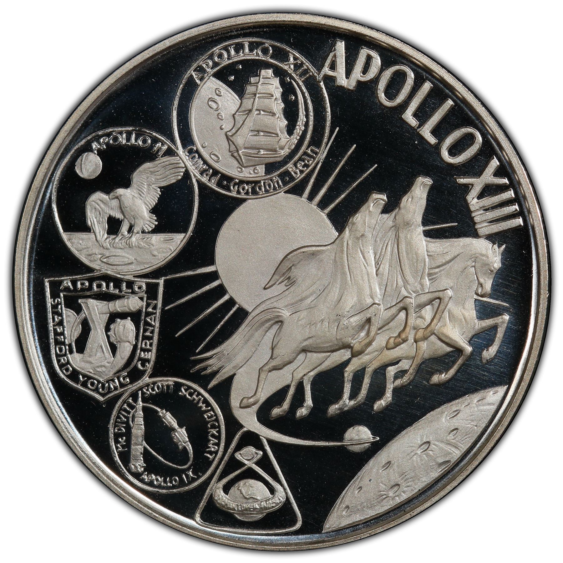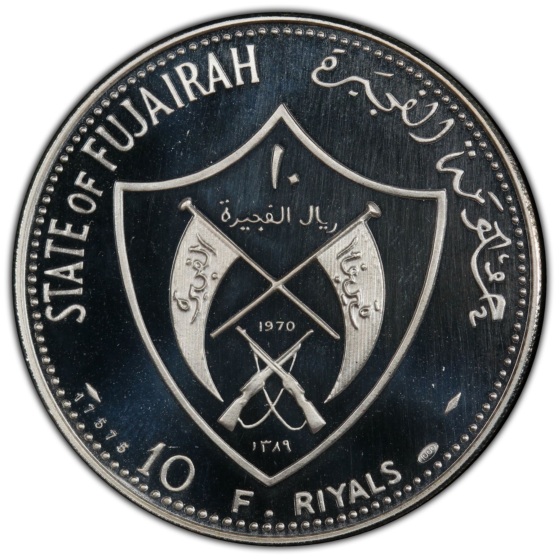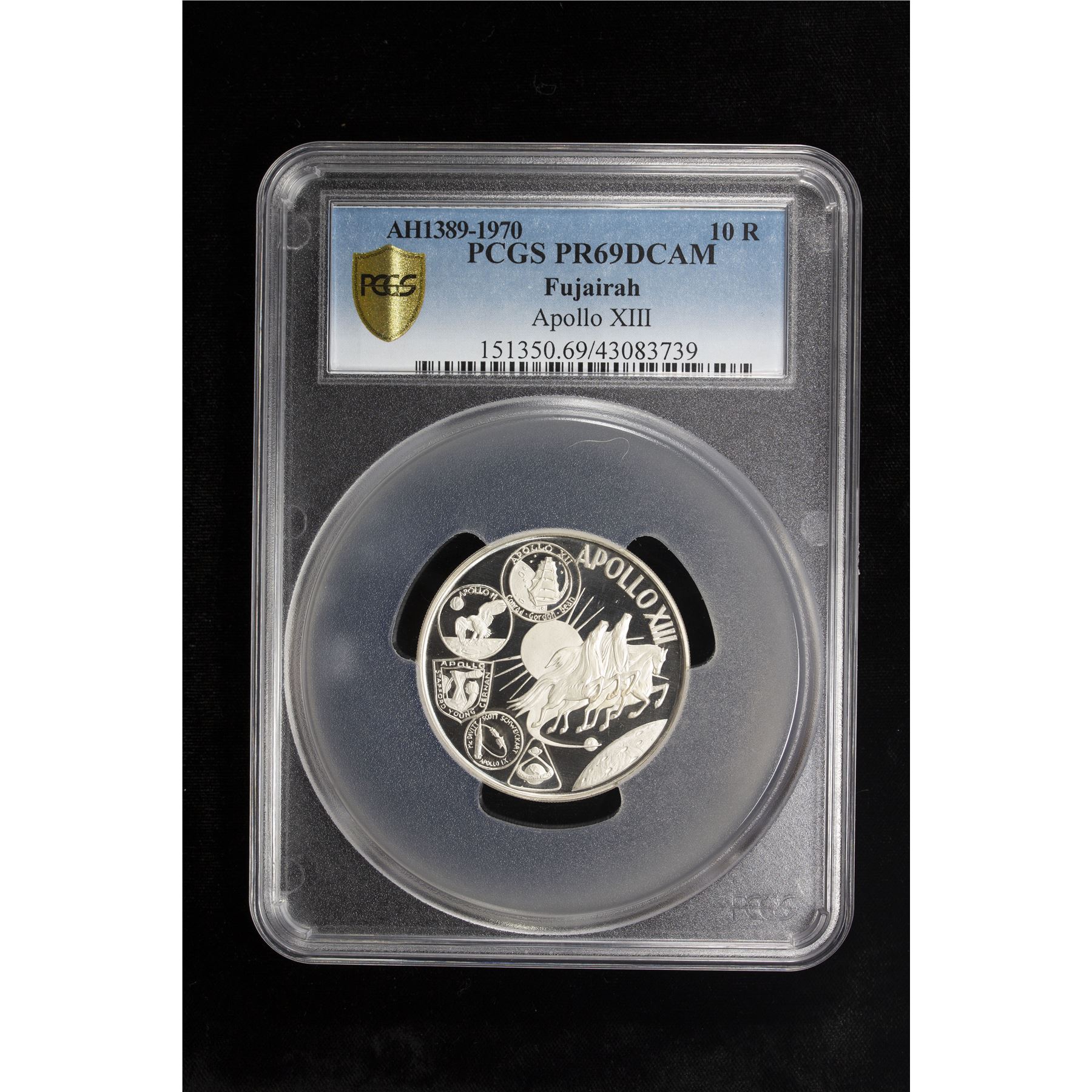 FUJEIRA: Muhammad b. Hamad al-Sharqi, 1952-1974, AR 10 riyals, 1970/AH1389, KM-19, Apollo Moon Landing Program - Apollo XIII with four Apollo mission badges, PCGS graded Proof 69 DCAM, ex Don Erickson Collection.