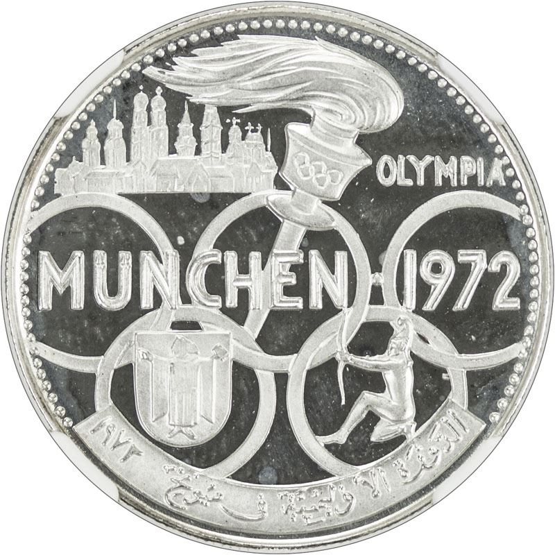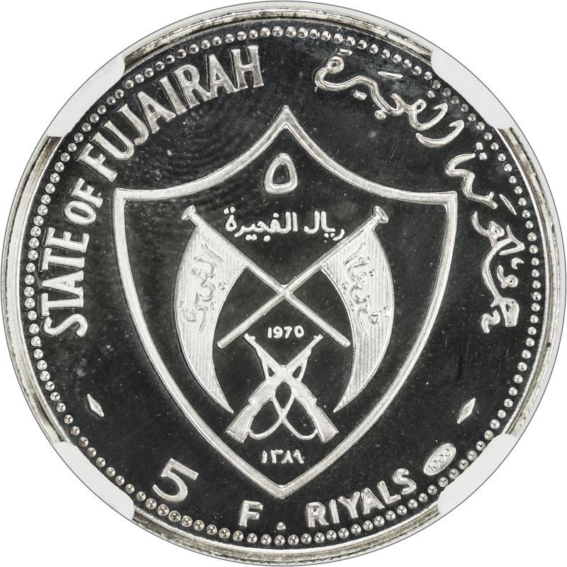 FUJEIRA: Muhammad b. Hamad al-Sharqi, 1952-1974, AR 5 riyals, 1970//AH1389, KM-3, 1972 Munich Olympics, mintage of 1200 pieces, NGC graded PF66 UC.