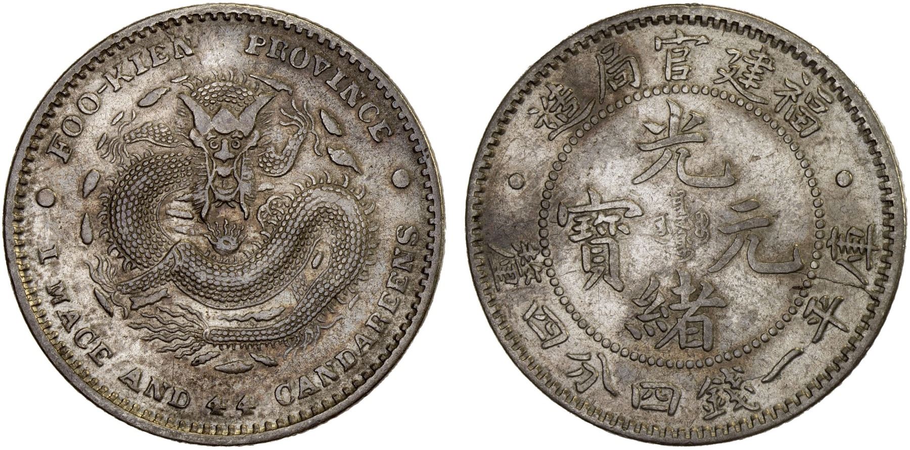 FUKIEN: Kuang Hsu, 1875-1908, AR 20 cents, ND (1898-1903), Y-104, L&M-296, five characters on top of reverse, variety with dot to either side of dragon, reverse cleaned, XF, ex Frank S. Robinson Collection.