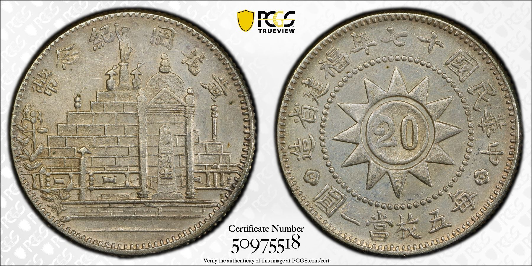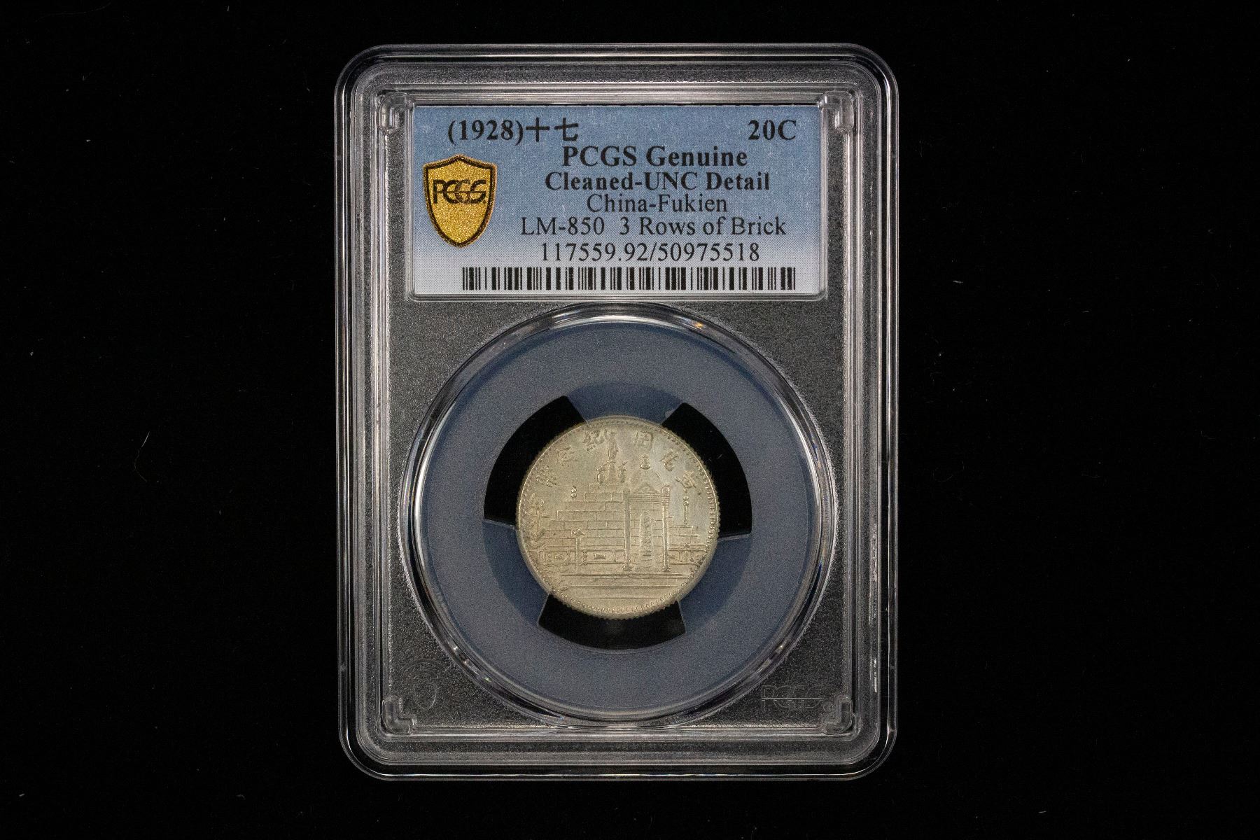 FUKIEN: Republic, AR 20 cents, year 17 (1928), Y-389.2, L&M-850, Canton Martyr's Memorial, cleaned, PCGS graded UNC details, ex Almer H. Orr III Collection.