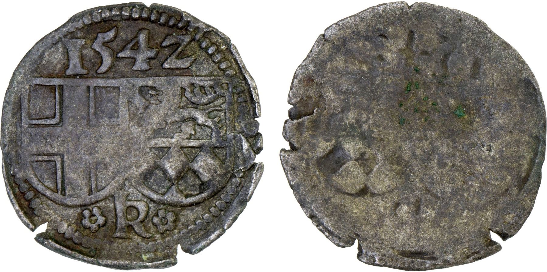 FULDA: Philipp Schenk zu Schweinsberg, 1541-1550, BI pfennig (0.26g), 1542, Gerling/Erdmann-61-1, uniface (einseitig) type, two shields, date above, R between rosettes below, extremely rare, VF. See WAG Online Auction 97, Lot 666 for another example of this type.