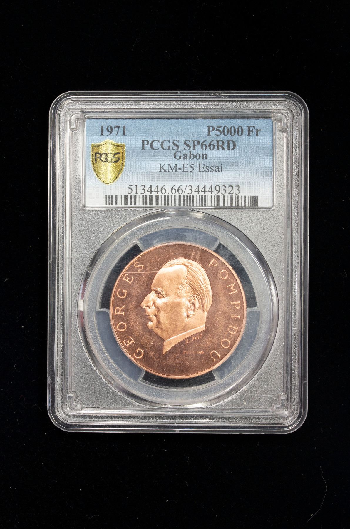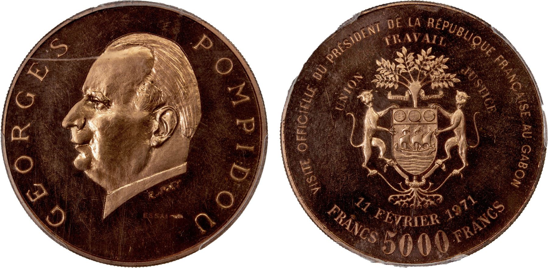 GABON: Republic, AE 5000 francs, 1971, KM-E5, essai in bronze for the gold type, French President Georges Pompidou Visit, PCGS graded Specimen 66 RD.