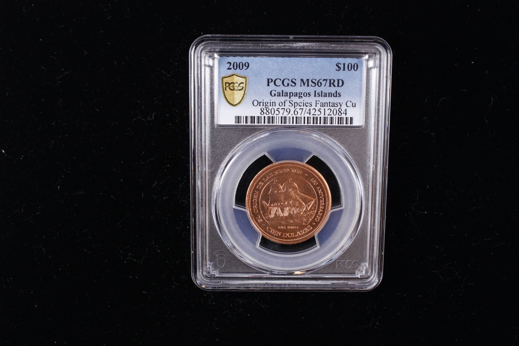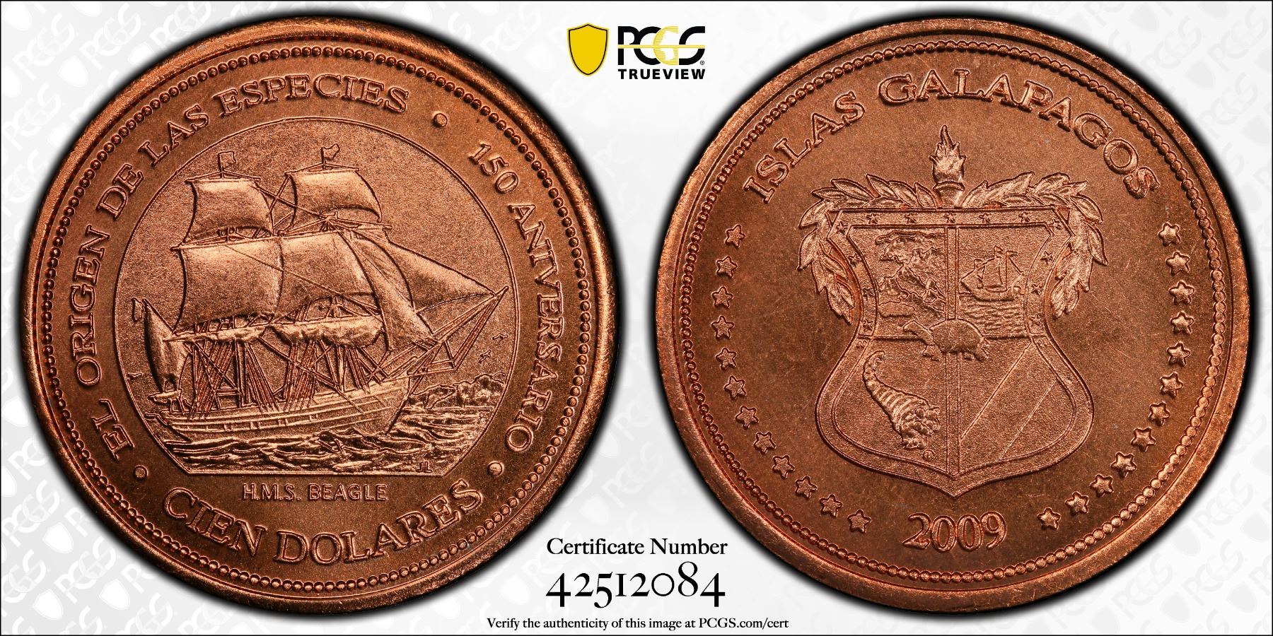 GALAPAGOS ISLANDS: AE 100 dólares, 2009, KM-X18a, 150th Anniversary "On the Origin of Species" - HMS Beagle, fantasy pattern essai in pure copper, mintage of only 30 pieces, very rare, PCGS graded MS67 RD. On the Origin of Species (or, more completely, On the Origin of Species by Means of Natural Selection, or the Preservation of Favoured Races in the Struggle for Life), published on November 24, 1859, is a work of scientific literature by Charles Darwin that is considered to be the foundation of evolutionary biology.Private pattern struck at the Patrick Mint. The mint began operating in 1972 and was known for striking mainly tokens until the mint was destroyed in the 2017 Tubbs Fire in the "Northern California Firestorm" along with 5,642 other structures in Santa Rosa, California.