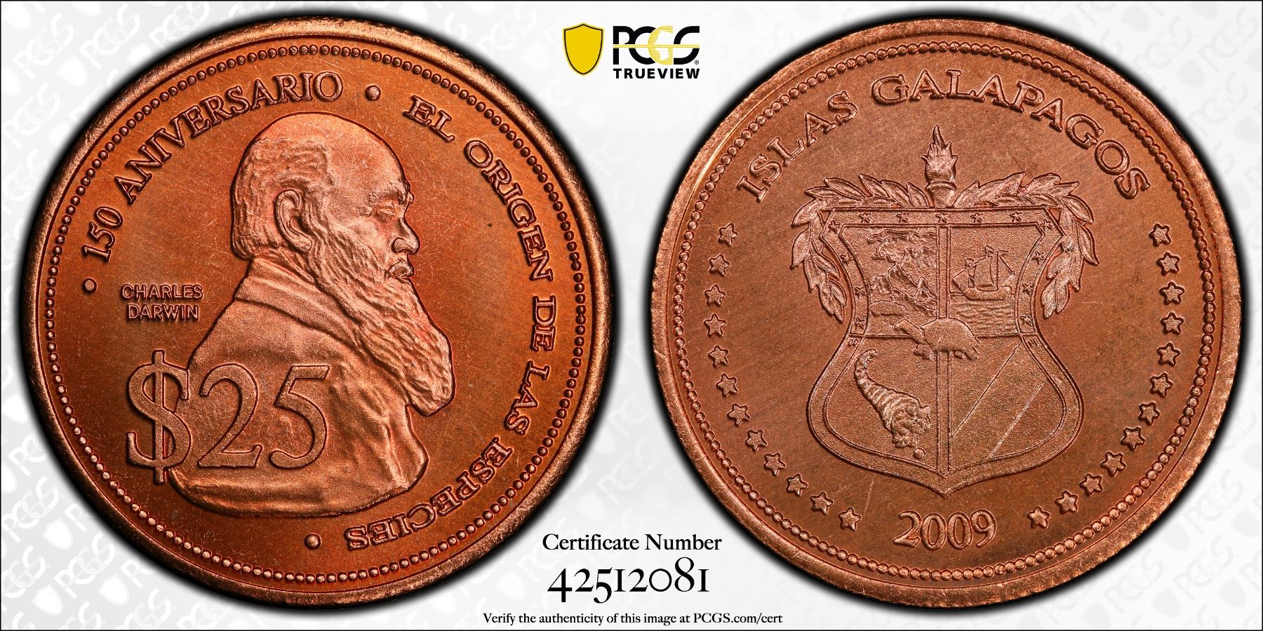GALAPAGOS ISLANDS: AE 25 dólares, 2009, KM-X17a, 150th Anniversary "On the Origin of Species" - Charles Darwin bust, fantasy pattern essai in pure copper, mintage of only 30 pieces, very rare, PCGS graded MS67 RD. On the Origin of Species (or, more completely, On the Origin of Species by Means of Natural Selection, or the Preservation of Favoured Races in the Struggle for Life), published on November 24, 1859, is a work of scientific literature by Charles Darwin that is considered to be the foundation of evolutionary biology.Private pattern struck at the Patrick Mint. The mint began operating in 1972 and was known for striking mainly tokens until the mint was destroyed in the 2017 Tubbs Fire in the "Northern California Firestorm" along with 5,642 other structures in Santa Rosa, California.
