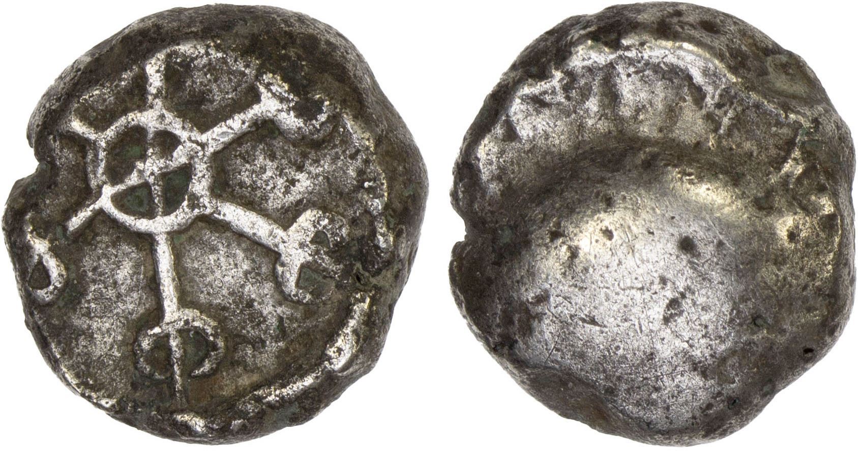 GANDHARA: Anonymous, ca. 400-325 BC, AR "unit" (3.57g), Pieper, 6-arm symbol, with two of the arms running through the central circle, blank reverse; very thick (4.5 mm) and narrow (13 mm); actual attribution undetermined, likely an emergency local issue; unpublished and believed to be unique, bold VF, RRR, ex Ian Todd Collection. The consignor dated this piece circa 550 BC, based on his calculating the weight as 1/3 croesus stater, but this is irrelevant. The form of the 6-arm symbol is very different from the Gandhara "bent-bar" and fractional piece, which are dated circa 450-340 BC, and this piece seems to have a later form of the 6-arm. Unfortunately, neither the find location nor the source of this piece was recorded, so this remains a "mystery coin" awaiting further research!
