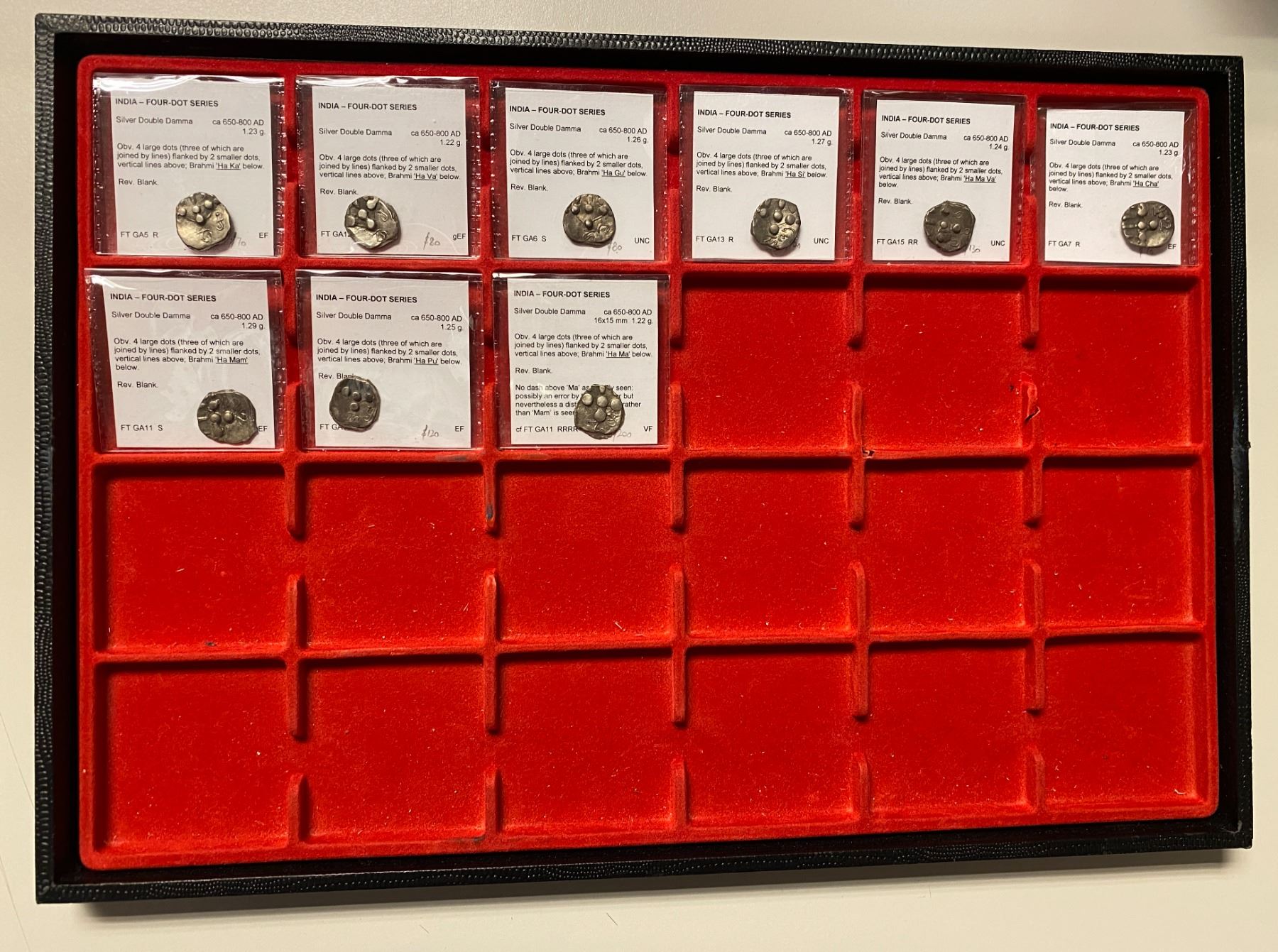 GANDHARA: Anonymous, ca. 650-800, LOT of 9 silver units, 4-dot type, single unit with weights 1.23g to 1.29g including GA5 (legend HaKa), GA6 (HaGu), GA7 (HaCha), GA10 (HaPu), GA11 (HaMam), GA11-var (HaMa), GA12 (HaVa). GA13 HaSi), and GA15 (HaMaVa), mostly EF condition; an attractive group, and all with Todd's full descriptions; retail value $600, lot of 9 pieces, ex Ian Todd Collection.