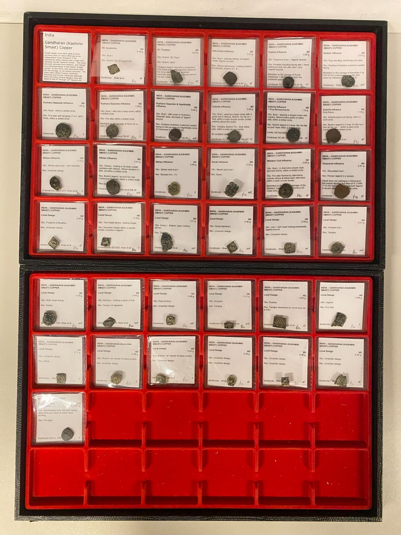 GANDHARA: KASHMIR-SMAST: LOT of 35 tiny copper coins, wide variation, struck from the 3rd to at least the 7th century AD: designs based on Indo-Greek, Kushan, Kidarite, Alchon, Nezak, Westen Turk, animals, human heads, and all manor of local themes; mostly round, some square or irregular shapes; average weight 0.5g to 1.0g; average Fine condition, but most with weakness, flat areas, etc.; an interesting group, viewing recommended; all with Todd's description; retail value $1100, lot of 35 pieces, ex Ian Todd Collection. About 15 exampled published by Vondrovec, including his types A12, A20, K3, K6, G1, G2, G20, G45, G56, G59, G68, and G71, the rest unlisted by Vondrovec, as is frequent for this series. Two have what appear to be Brahmi names, tentatively read as Tityajaya and Jayasimha by the consignor.