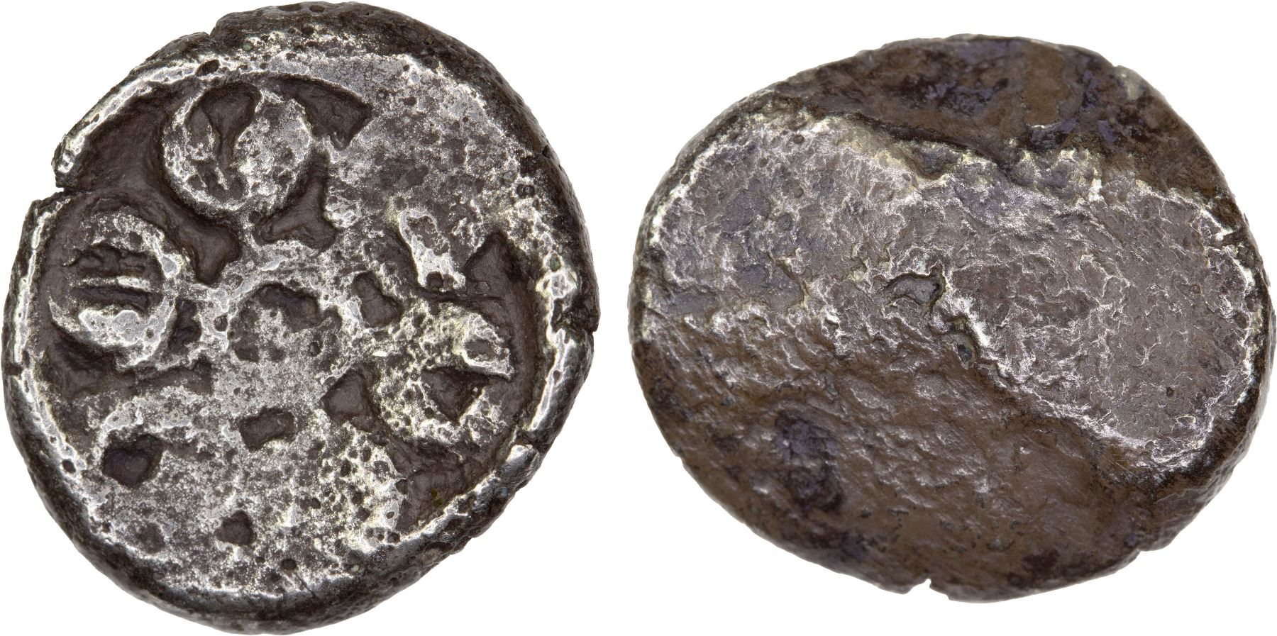 GANDHARA: Punchmarked, 5th century BC, AR plated 1/2 shatamana (4.95g), Hardaker-BB19, MATEC-2121, 6-arm Gandharan symbol, blank reverse, some porosity, F-VF, RRR, ex Wilfried Pieper Collection. From the consignor: "Mitchiner listed only one of the round half shatamanas. And recently Hardaker (2019) as well couldn't find any other such specimens and classified the type as extremely rare." There are no examples on CoinArchives.