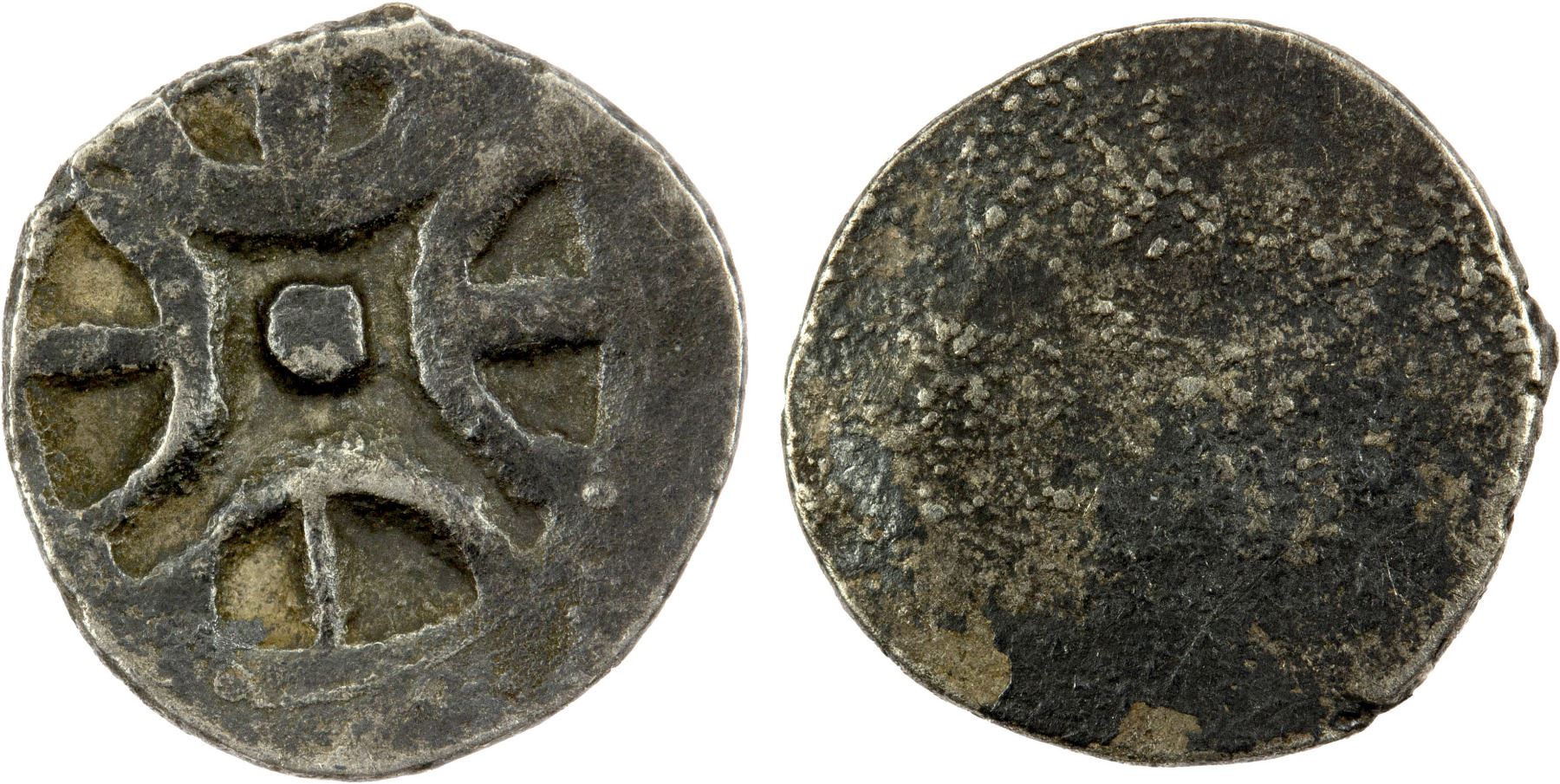 GANDHARA: Punchmarked, ca. 450-300 BC, AR 1/32 shatamana (0.28g), Pieper-31, modified Gandhara symbol with 4 arms, uniface, EF, RR, ex Wilfried Pieper Collection.