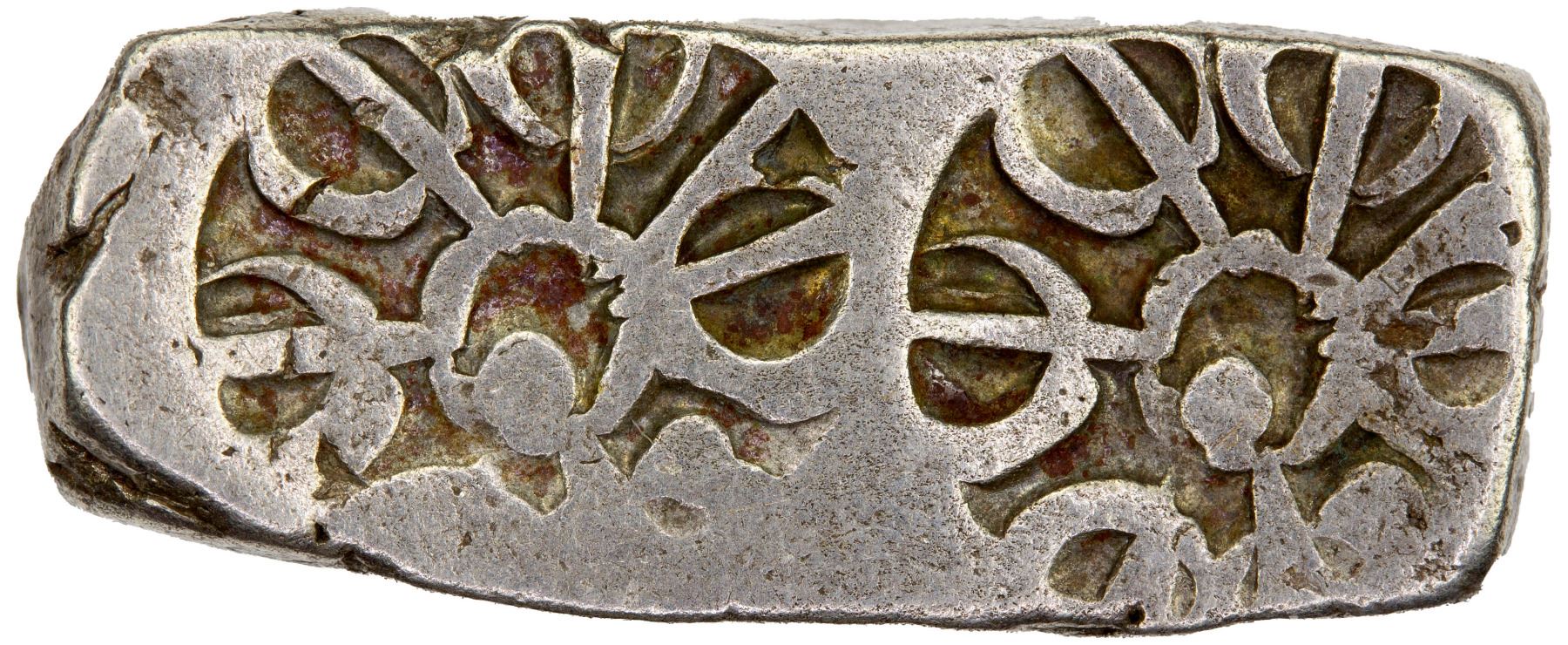 GANDHARA: Punchmarked, ca. 450-300 BC, AR shatamana (11.34g), Pieper-22, 6-arm Gandharan symbol twice; bent-bar style, but relatively flat, excellent VF, R, ex Wilfried Pieper Collection.