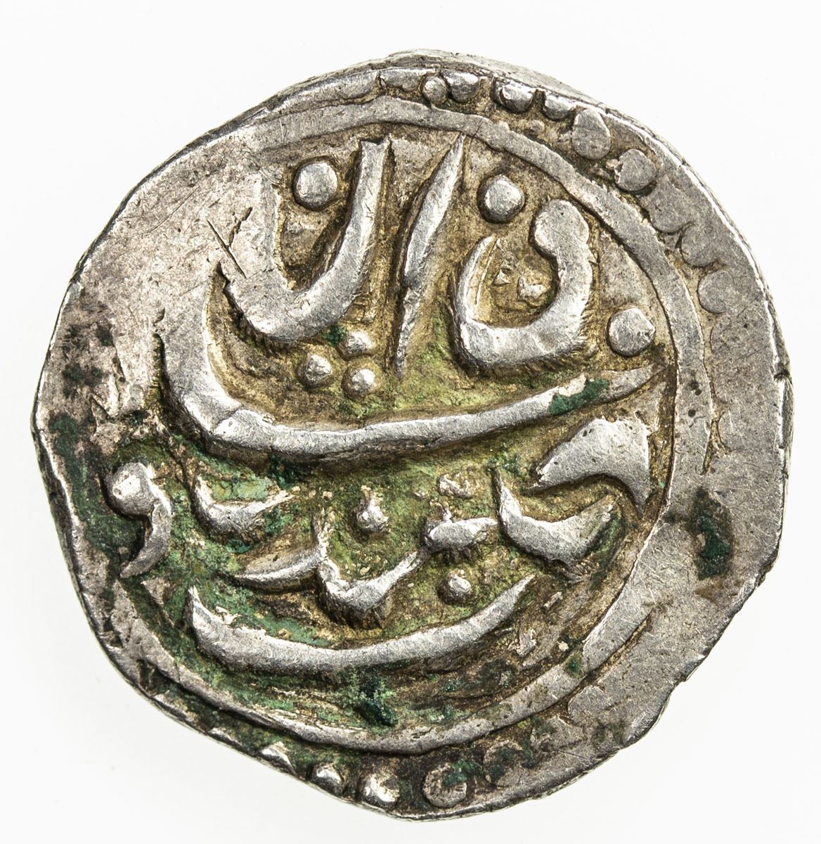 GARHWAL: temp. Pradip Shah, 1717-1772, AR timasha (2.54g), ND, Rh-Plate 24:10 (this piece), cf. KM-3, type derived from the issue in the name of Farrukhsiyar, with unread mint name, VF, R, ex SARC Auction 28, Lot 2457; ex Paul Stevens Collection; ex John Deyall Collection.