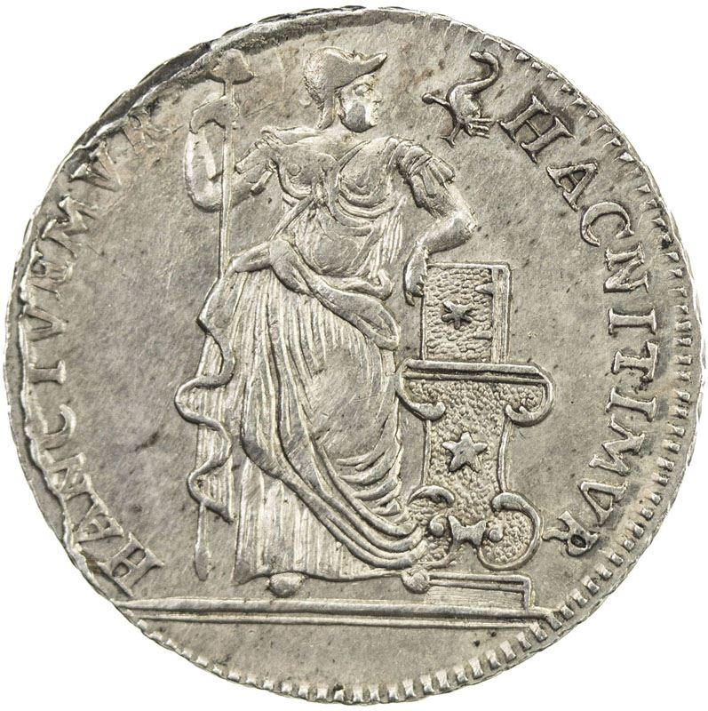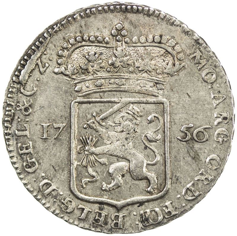 GELDERLAND: AR ¼ gulden (2.95g), 1756, KM-89, struck from dies deteriorating around the edge, much original luster, choice About Unc.