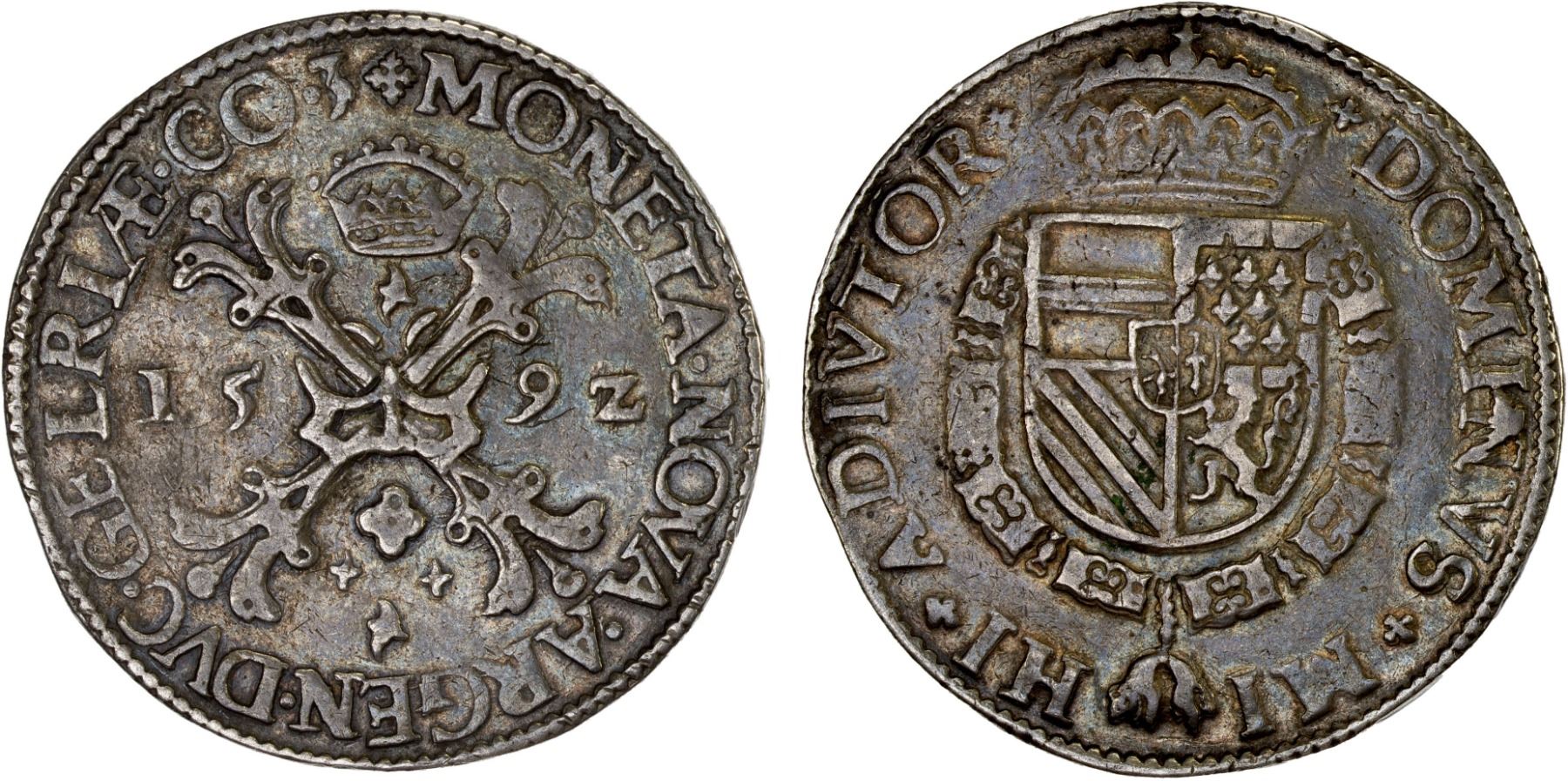 GELDERLAND: United Netherlands, AR Burgundian daalder (28.59g), 1592, Dav-8822, crowned diagonal cross with "15" and "92" in the left and right angles, respectively, with "+MONETA NOVA ARGEN DVC GELRIAE CO 3" around // crowned arms with collar around and +DOMINVS + MI - HI = ADIVTOR+ around, F-VF.