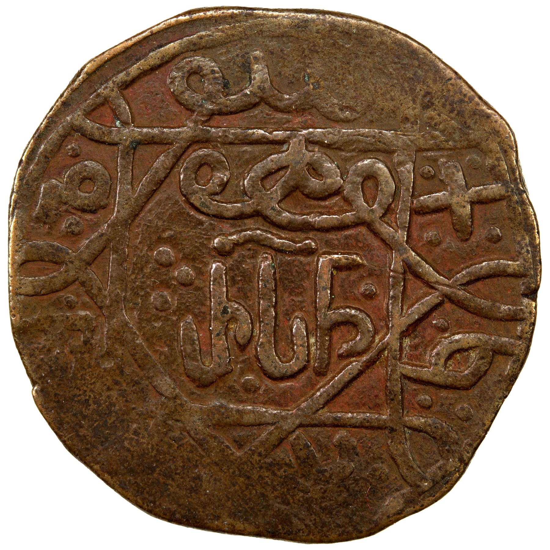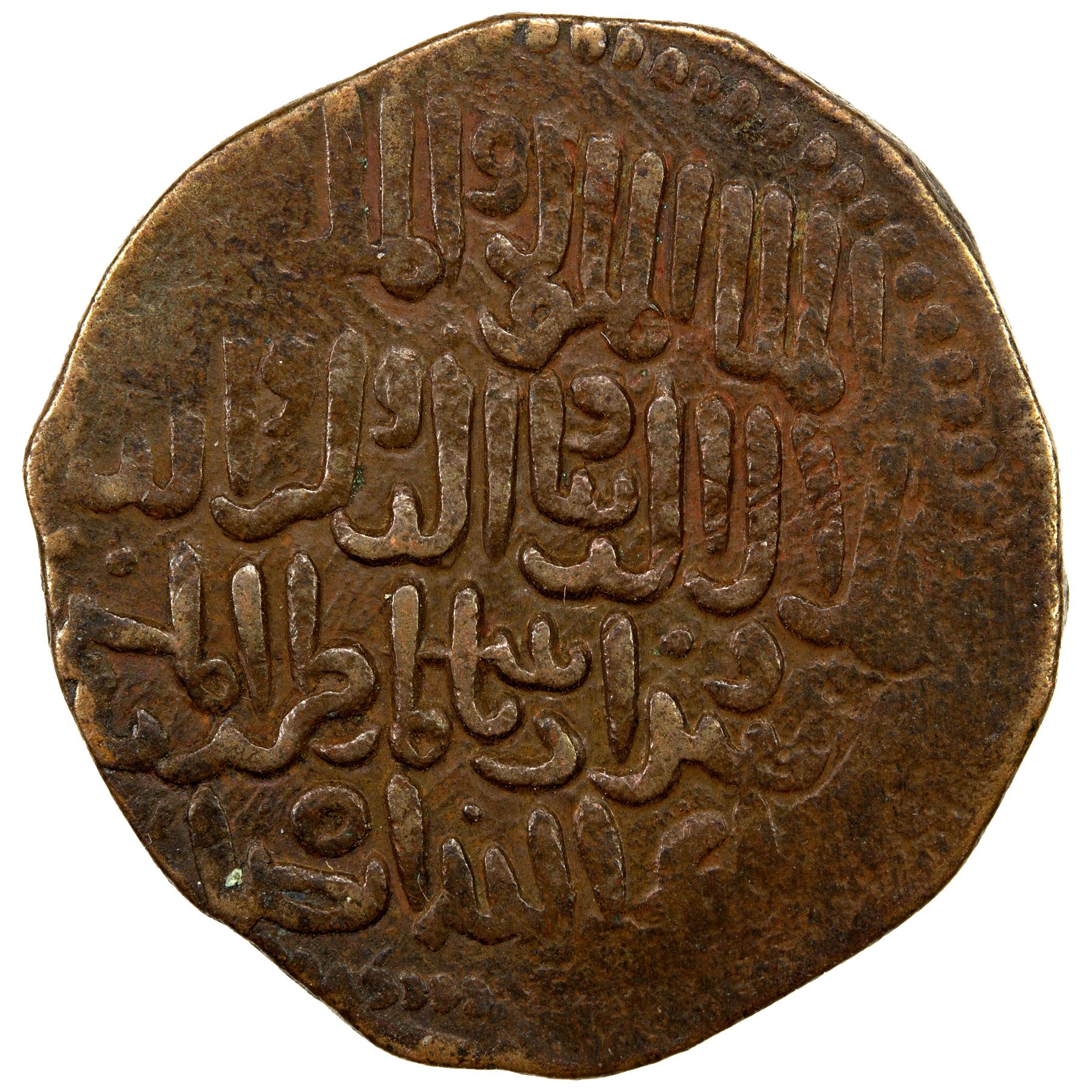 GEORGIA: Queen Rusudan, 1223-1245, AE fals (6.51g), NM, Kronikon-447 (1227), Bennett-191ff, Mtavruli monogram (RSN for Rusudan) // Arabic royal legend, with the Christian title zahir al-masih ("champion of the Messiah"), bold strike with minimal weakness towards the rim, VF-EF.