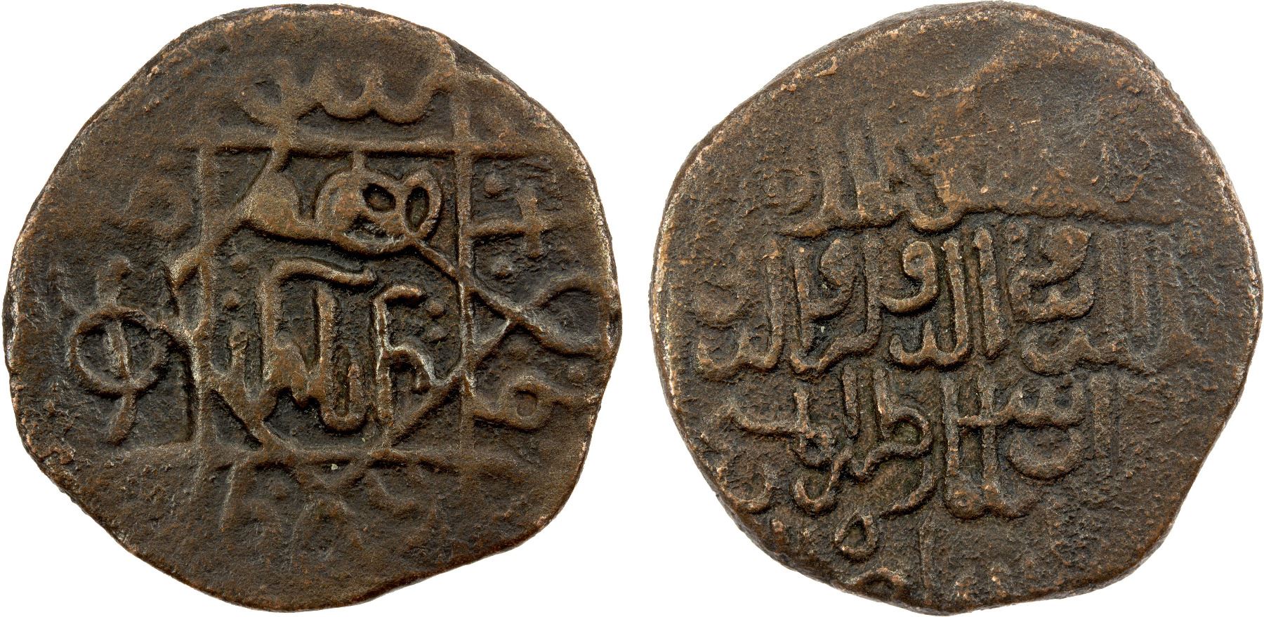GEORGIA: Queen Rusudan, 1223-1245, AE round unit (6.09g), Koronikon-447 (=1227 AD), Bennett-191/200, Mtavruli legend scattered within ornamental frame // 4-line Arabic legend, with countermark #10, VF, ex Robert A. Rosenfeld Collection.