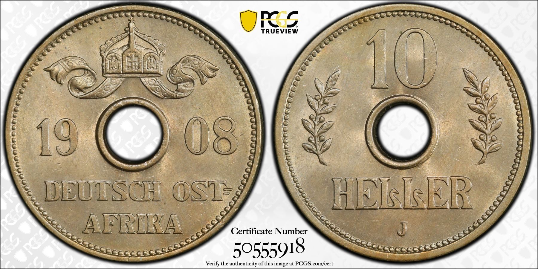 GERMAN EAST AFRICA: Wilhelm II, 1888-1918, 10 heller, 1908-J, PCGS MS64