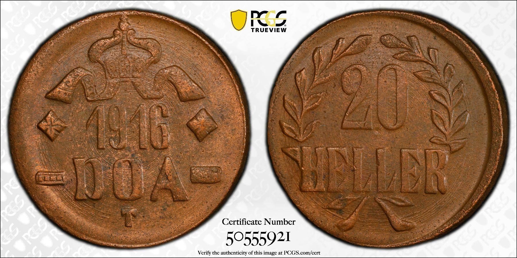 GERMAN EAST AFRICA: Wilhelm II, 1888-1918, 20 heller, 1916-T, PCGS MS63 BN