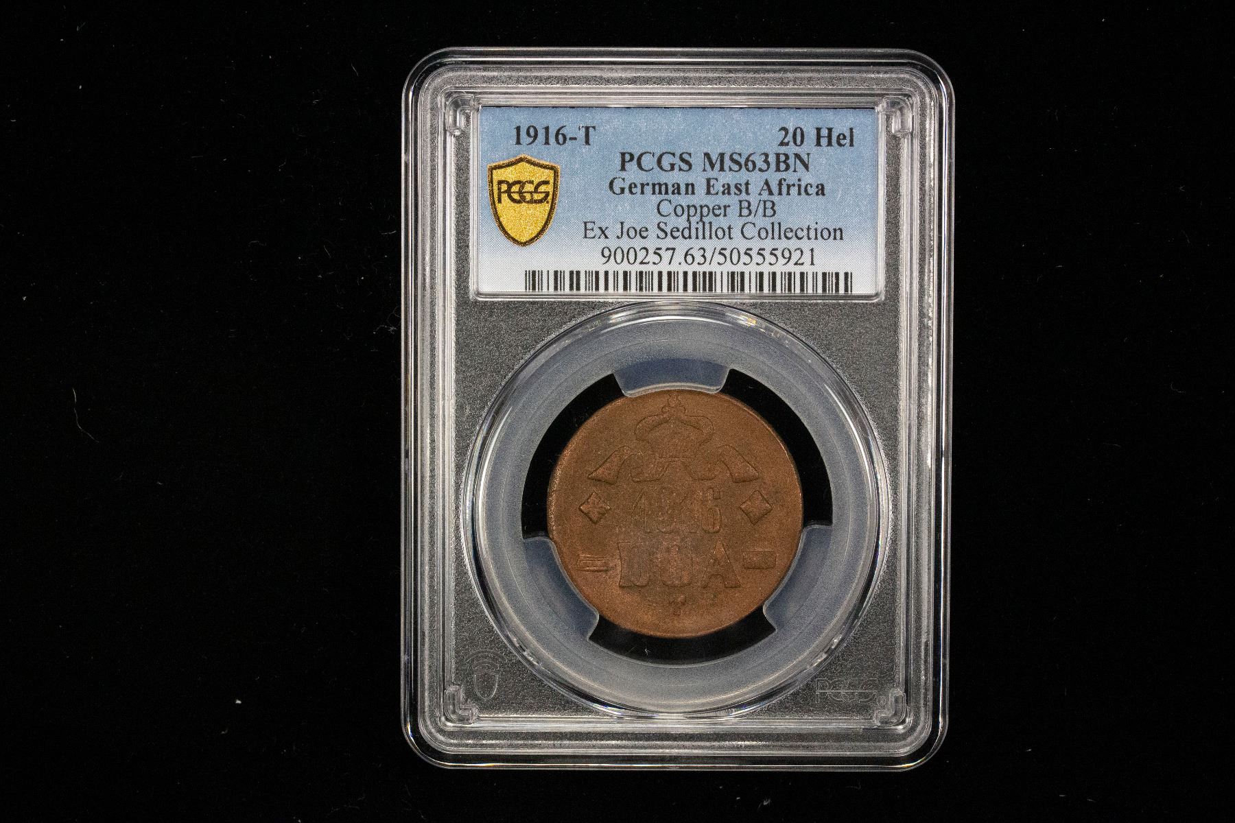 GERMAN EAST AFRICA: Wilhelm II, 1888-1918, 20 heller, 1916-T, KM-15, WWI Emergency Coinage in copper, obverse B with small crown, reverse B with pointed tips on L's, a lovely mint state example! PCGS graded MS63 BN, ex Joe Sedillot Collection. Captain Looff of the cruiser SMS Königsberg ordered his ship scuttled, but not before everything of use was removed, including parts from which a minting machine was built for the Tabora Mint. The metal for this mintage was obtained from spent cartridges and artillery shell casings.