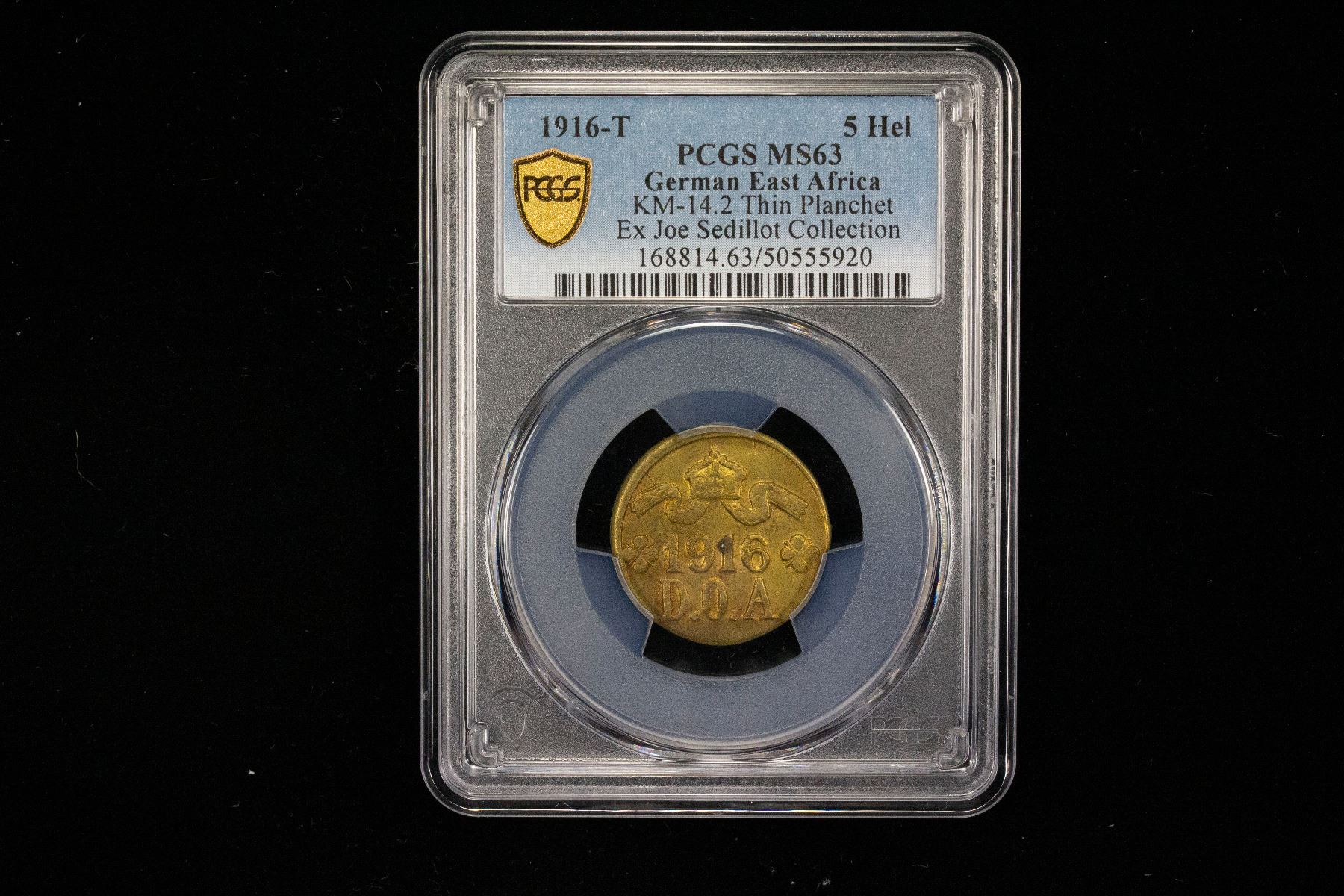 GERMAN EAST AFRICA: Wilhelm II, 1888-1918, 5 heller, 1916-T, KM-14.2, WWI Emergency Coinage in brass, thin planchet variety, a lovely mint state example! PCGS graded MS63, ex Joe Sedillot Collection. Captain Looff of the cruiser SMS Königsberg ordered his ship scuttled, but not before everything of use was removed, including parts from which a minting machine was built for the Tabora Mint. The metal for this mintage was obtained from spent cartridges and artillery shell casings.