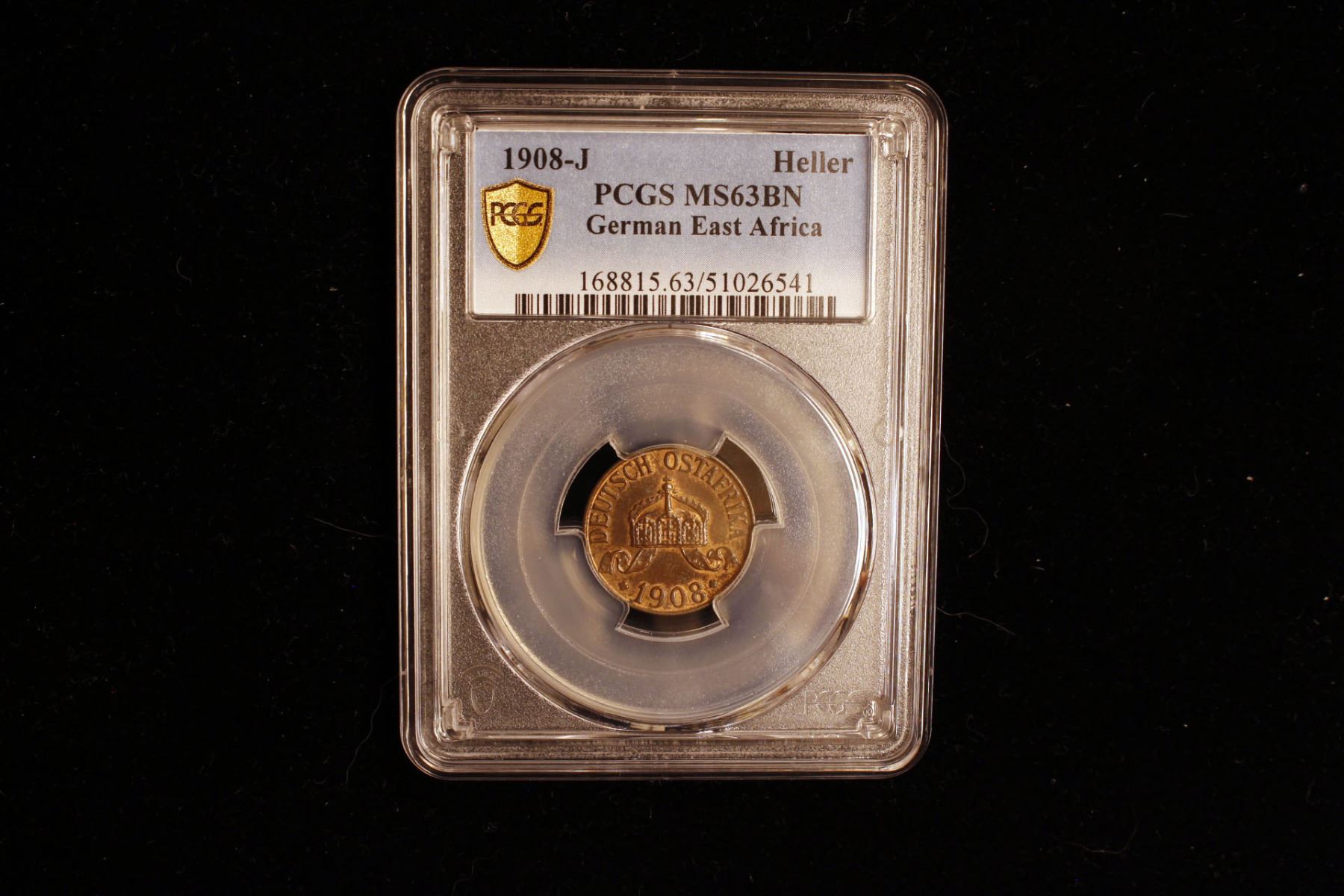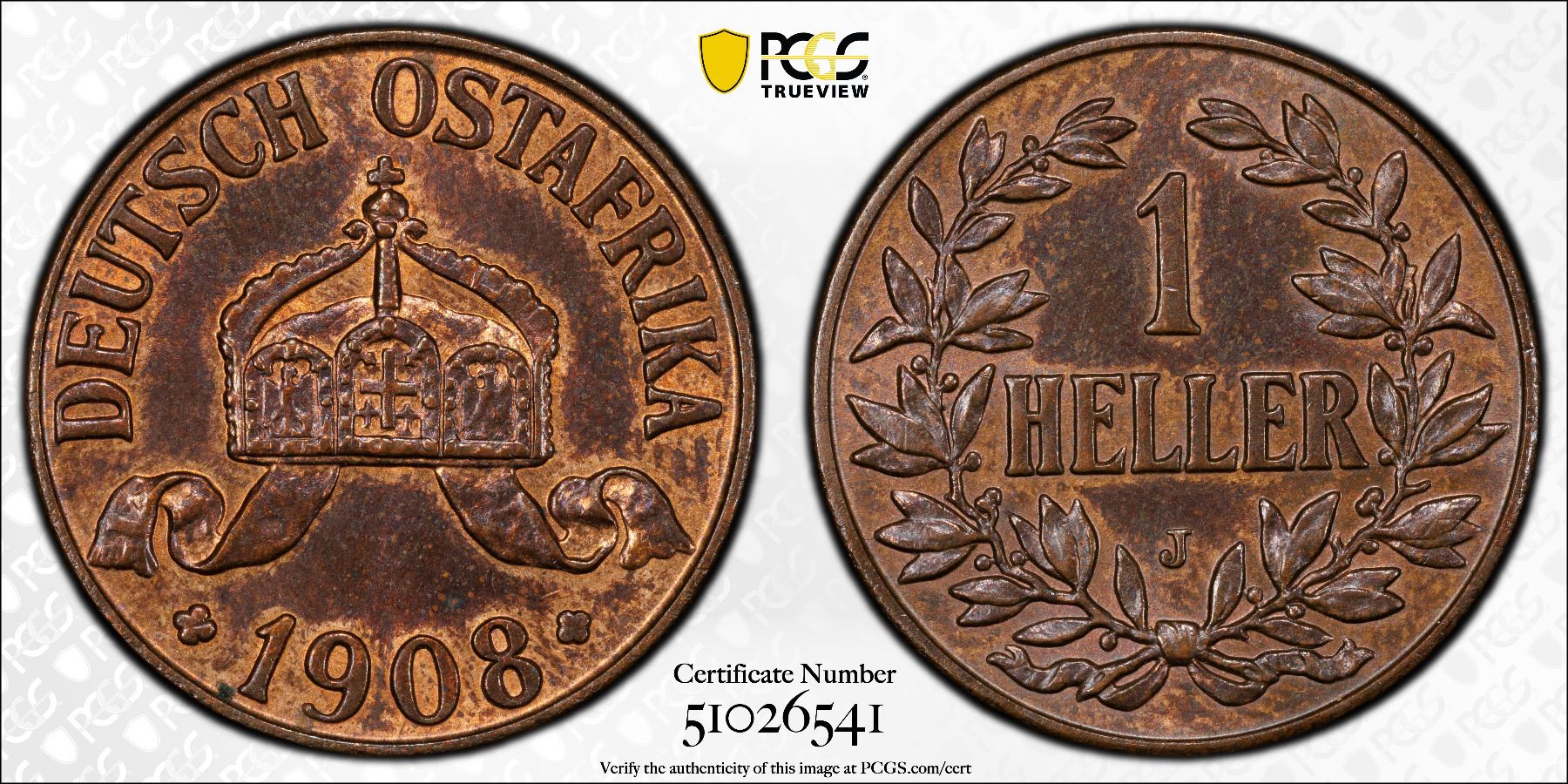 GERMAN EAST AFRICA: Wilhelm II, 1888-1918, AE heller, 1908-J, PCGS MS63 BN