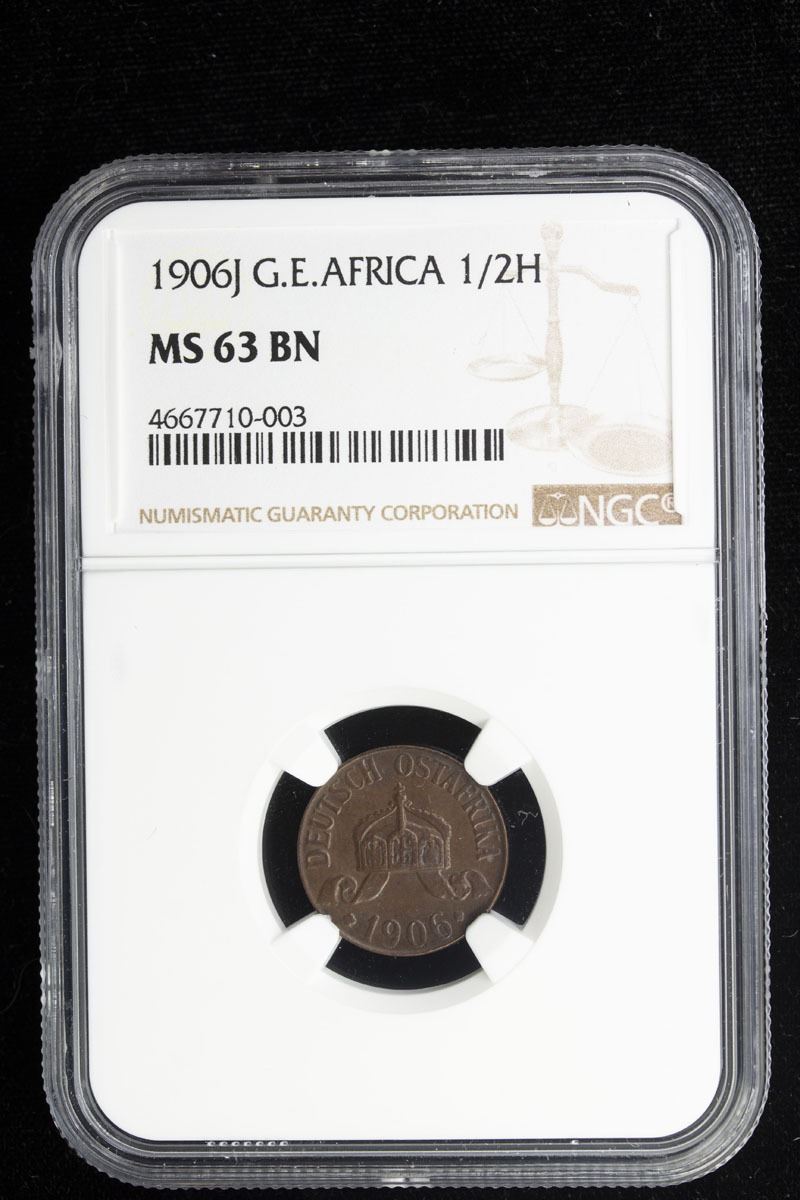 GERMAN EAST AFRICA: Wilhelm II, 1891-1918, AE ½ heller, 1906-J, KM-6, a attractive mint state example! NGC graded MS63 BR.