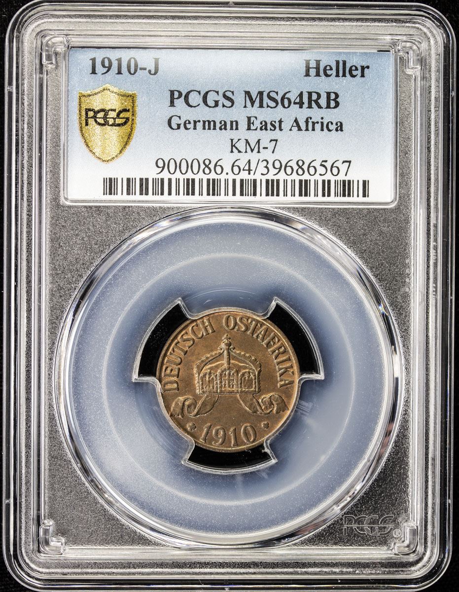 GERMAN EAST AFRICA: Wilhelm II, 1891-1918, AE heller, 1910-J, KM-7, a lovely mint state example! PCGS graded MS64 RB.