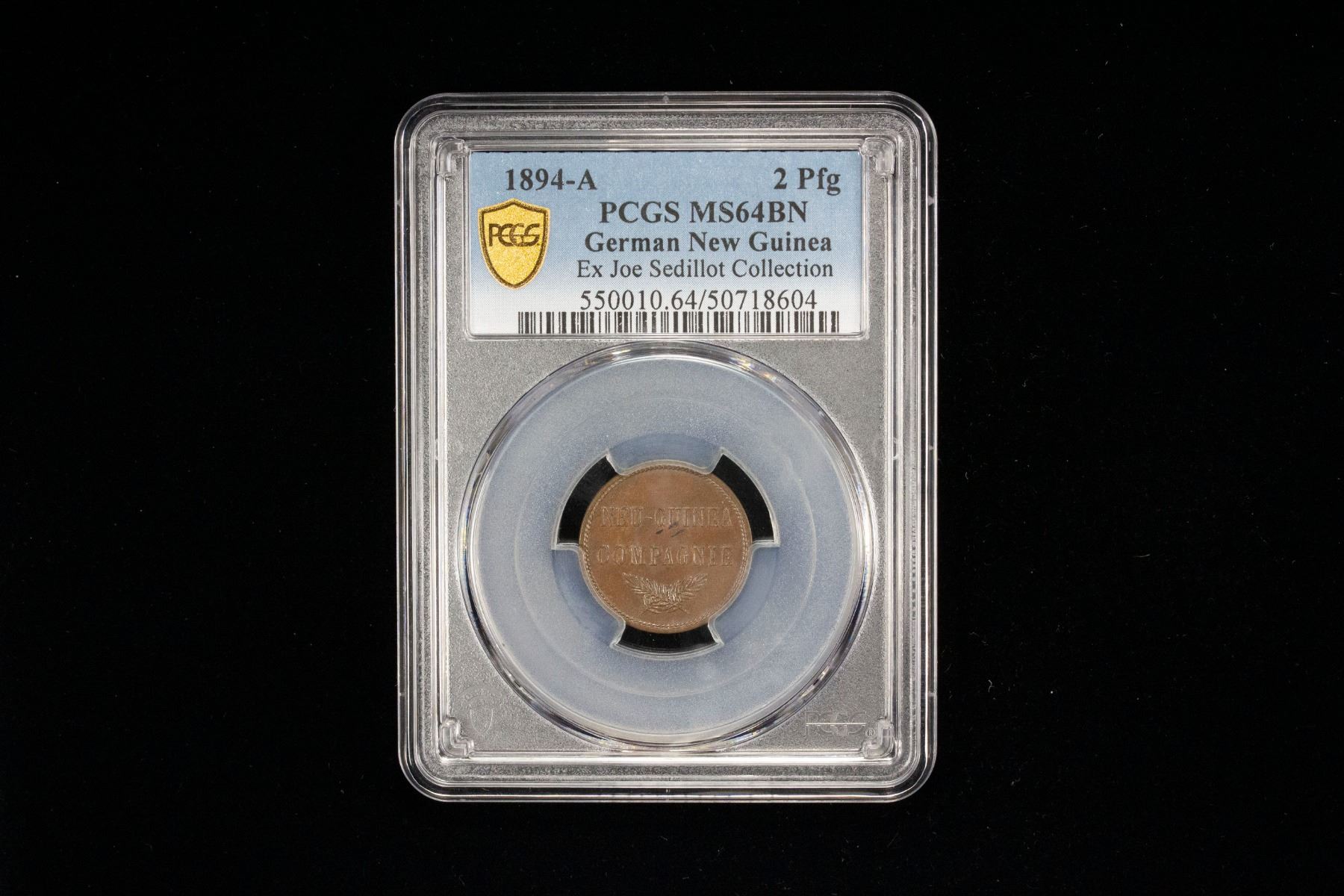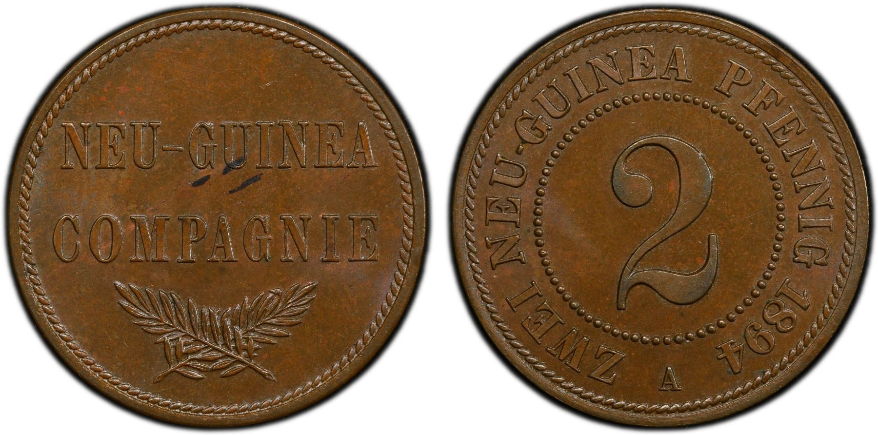 GERMAN NEW GUINEA: Wilhelm II, 1888-1918, AE 2 pfennig, 1894-A, KM-2, Deutsche Neuguinea-Compagnie issue, a wonderful lustrous chocolate-brown mint state example! PCGS graded MS64 BN, ex Joe Sedillot Collection. One of 16,768 coins possibly remaining with an original mintage of 250,000 and an incredible amount of 233,322 being melted down.