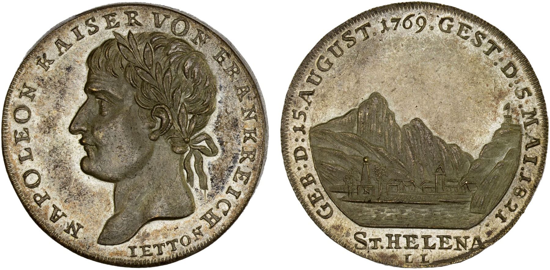 GERMAN STATES: AE jeton (15.13g), 1821, Bramsen-1847, Julius-3719, 33mm silvered bronze jeton on the Death of Napoleon by L. Lauer, laureate head left with NAPOLEON KAISER VON FRANKREICH - JETTON around // view of the island of St. Helena and the tomb of Napoleon with "GEB D 15.AUGUST 1769 GEST D 5.MAI.1821" around and ST.HELENA in exergue, lightly toned, rare, plain edge, XF-AU.