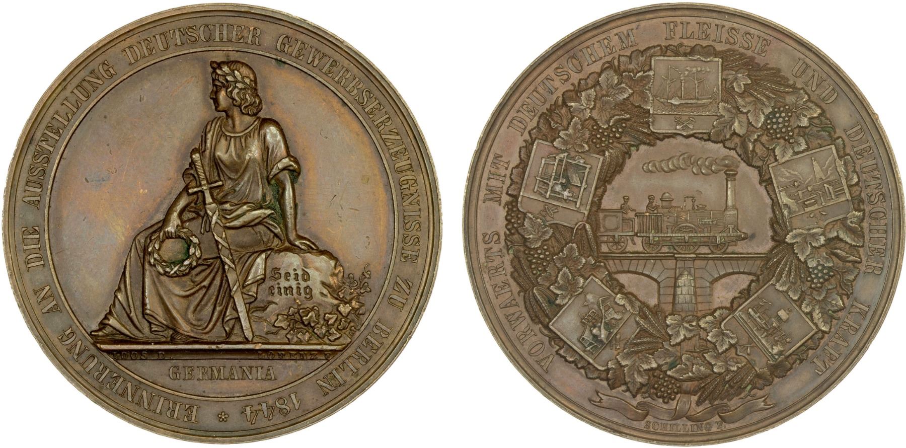 GERMAN STATES: AE medal (50.45g), 1844, Marienburg Coll.-4234, Wurzbach Coll.-685, Dory/Kubinsky-260, 45mm bronze medal for the Exhibition of German Industrial Products in Berlin by H. Lorenz and E. Schilling for Loos, Germania seated left holding sword and wreath with GERMANIA below, all within inner circle with "ERINNERUNG AN DIE AUSSTELLUNG DEUTSCHER GEWERBSERZEUGNISSE ZU BERLIN 1844" around // locomotive traveling right on bridge with various economic endeavors depicted within floral wreath with VORWAERTS MIT DEUTSCHEM FLEISSE UND DEUTSCHER KRAFT around, a few hairlines in obverse field, plain edge, AU.