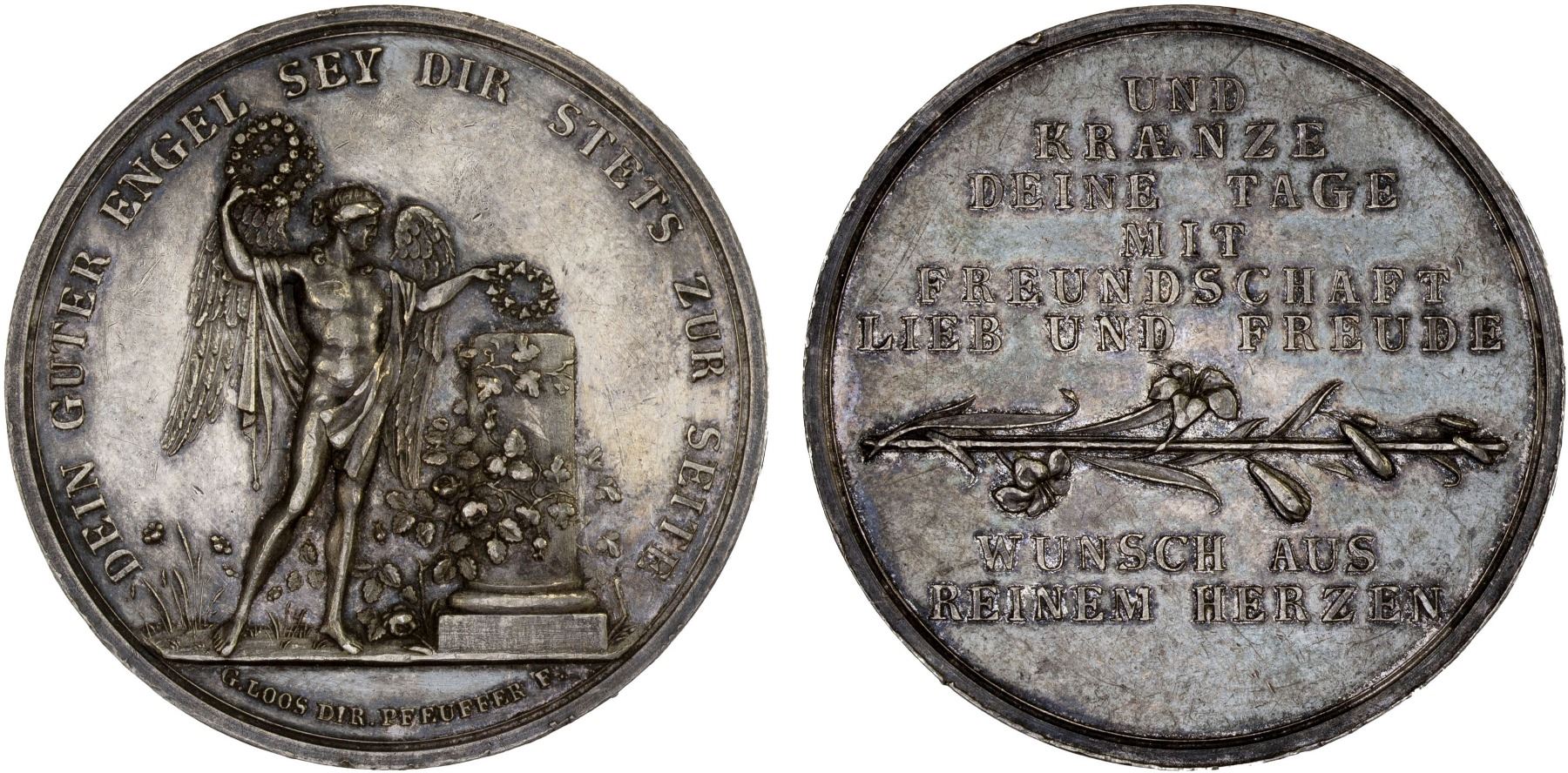 GERMAN STATES: AR medal (14.72g), ND (1800), Sommer-B 50, 36mm silver medal for New Year's Day by Loos & Pfeuffer, angel with laurel wreaths before a pedestal with DEIN GUTR ENGEL SEY DIR STETS ZUR SEITE around // horizontal flower stem with UND / KRAENZE / DEINE TAGE / MIT / FREUNDSCHAFT / LIEB UND FREUDE above and WUNSCH AUS / REINEM HERZEN below, lightly cleaned, has partially retoned, plain edge, XF-AU.