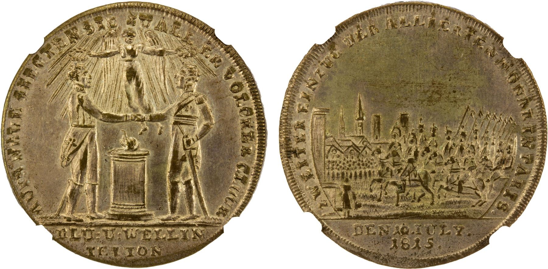 GERMAN STATES: silvered AE jeton, 1815, Bramsen-1676, commemorating the Seventh Coalition's Entry into Paris on July 10, 1815, Field Marshal Blücher and Duke of Wellington clasping hands over flaming altar, Victory flying above and crowning both with laurel wreaths, AUFS NEUE SIEGTEN SIE ZU ALLER VÖLCKER GLÜCK, BLÜ: U: WELLIN: / IETTON in exergue // the two generals and officers on horseback left, crowd and buildings in background, ZWEITER EINZUG DER ALLIERTEN MONAR: IN PARIS, DEN 10. IULY / 1815 in exergue, lightly lustrous, a lovely example depicting the coalition's final victory over Napoleon, NGC graded AU58.