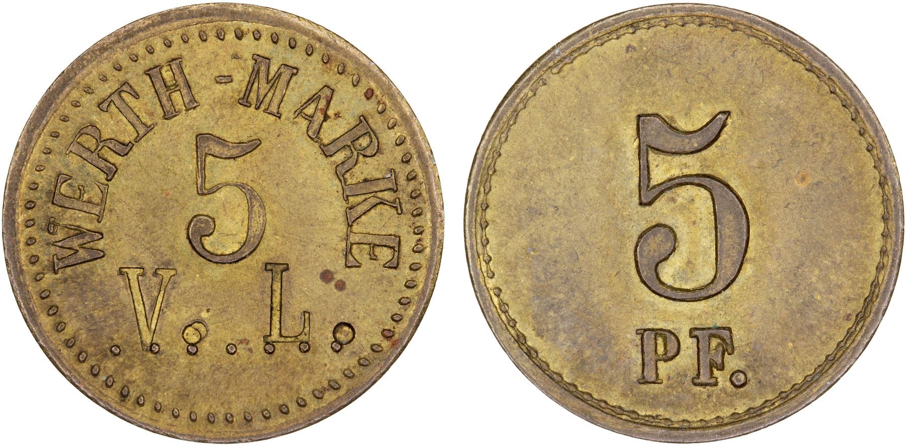 GERMANY: 100 pfennig token, ND, Menzel-, brass WERTH-MARKE and denominational numeral at center, V.L. stamped below // denominational numeral at center, AU. Werth-Marke tokens are German token issues minted between 1871 and 1948, often made of copper, brass, zinc and featuring values like 10, 15, 20, 25, 50, 100 and 500 Pfennig, and struck in a variety of shapes. These were issued by private firms, academic institutions, local municipalities, and even the German Imperial Navy.
