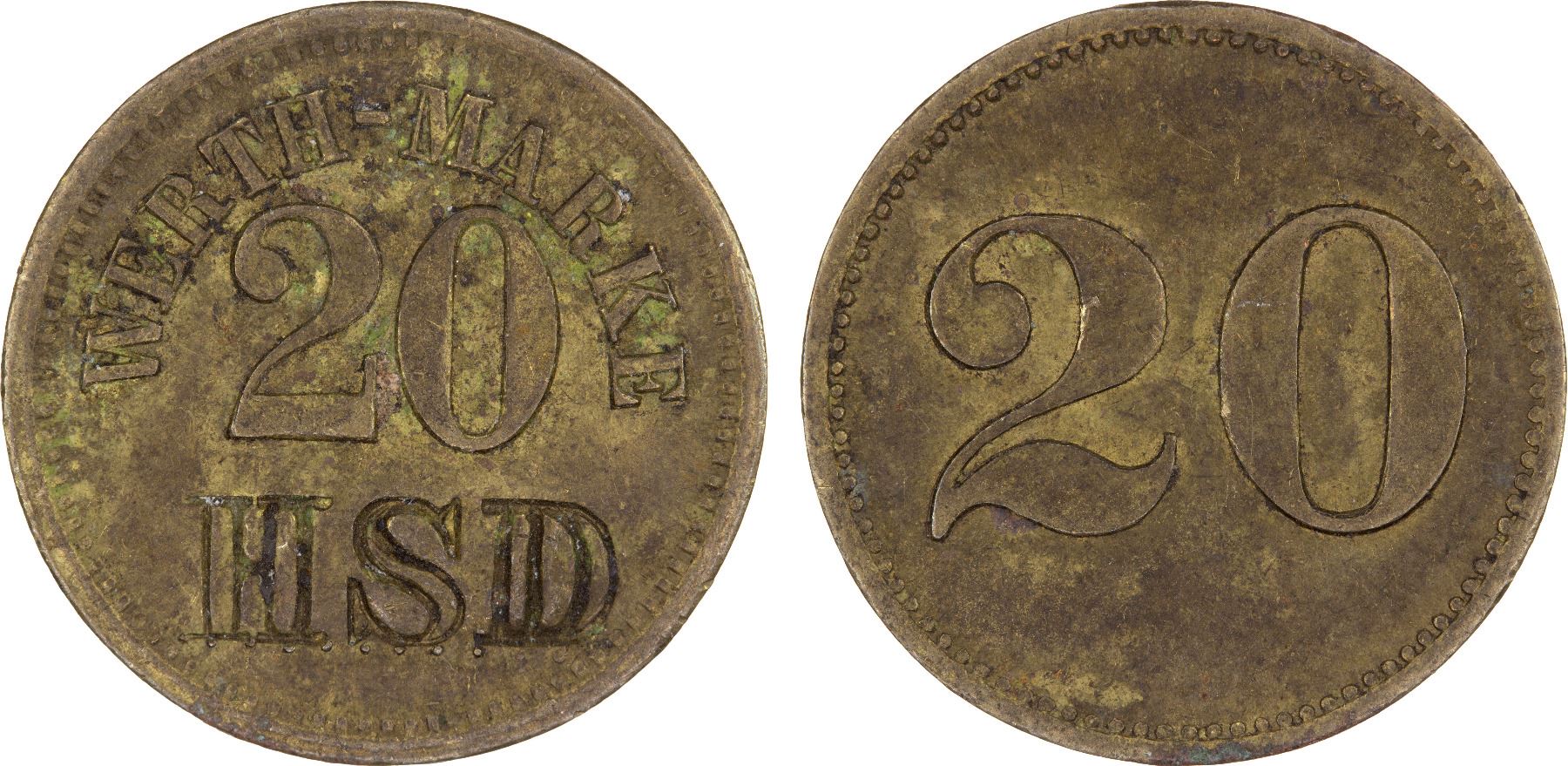 GERMANY: 20 pfennig token, ND, Menzel-, brass WERTH-MARKE and denominational numeral at center, HSD stamped below // denominational numeral at center, XF. Werth-Marke tokens are German token issues minted between 1871 and 1948, often made of copper, brass, zinc and featuring values like 10, 15, 20, 25, 50, 100 and 500 Pfennig, and struck in a variety of shapes. These were issued by private firms, academic institutions, local municipalities, and even the German Imperial Navy.