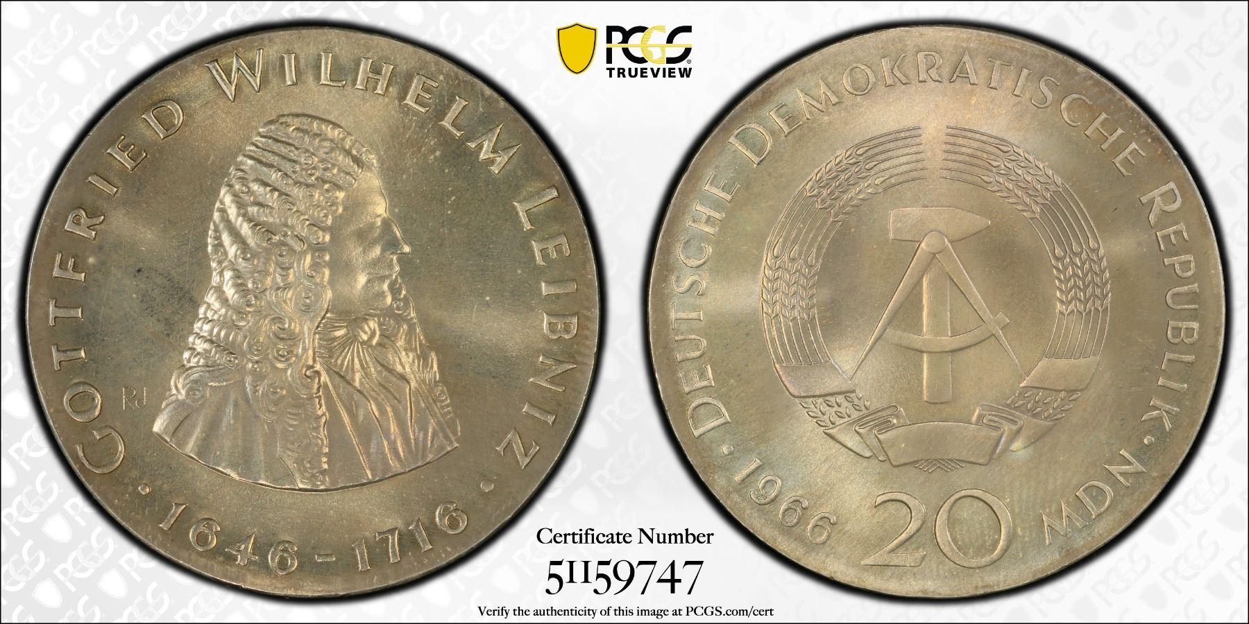 GERMANY: Democratic Republic: AR 20 mark, 1966, KM-16, 250th Anniversary - Death of Gottfried Wilhelm Leibniz, an incredible example, PCGS graded MS67.
