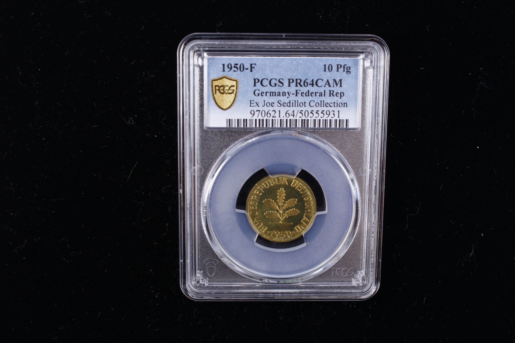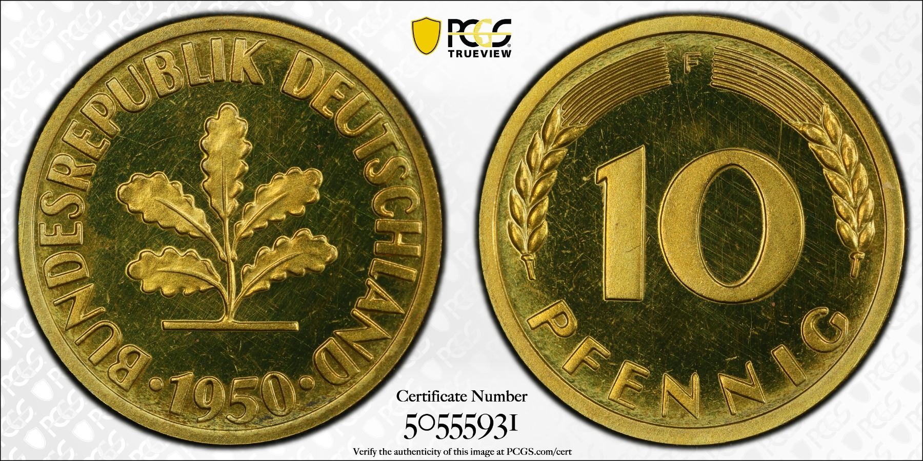 GERMANY: Federal Republic, 10 pfennig, 1950-F, KM-108, J-383, a wonderful proof quality example! PCGS graded Proof 64 CAM, ex Joe Sedillot Collection.