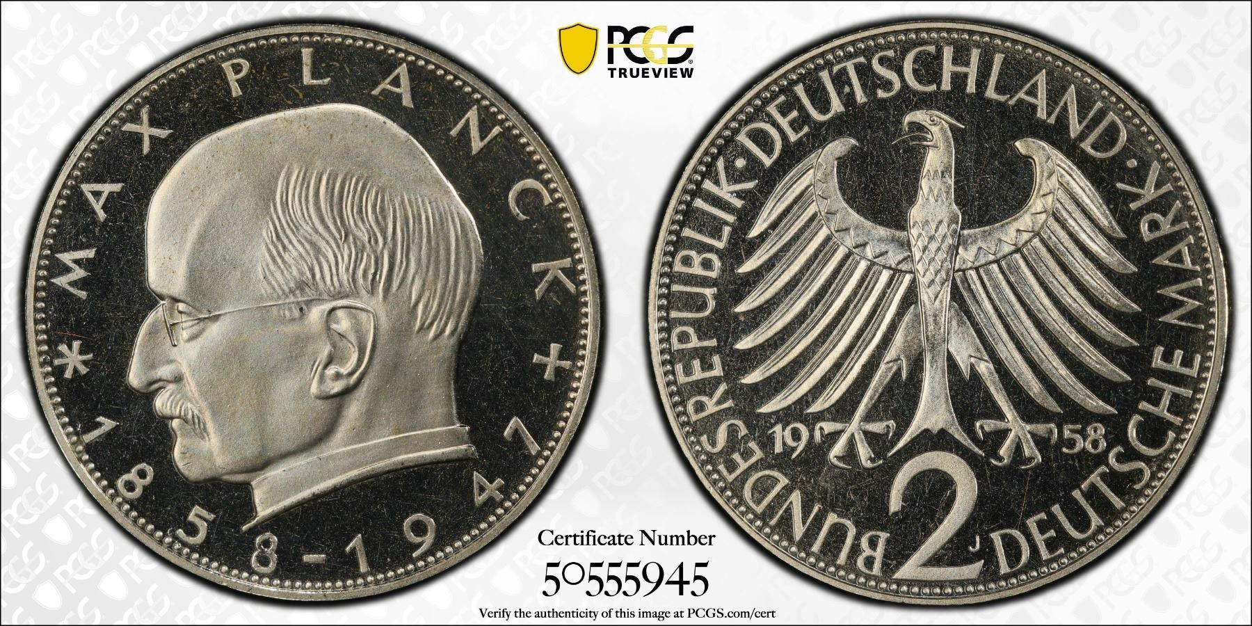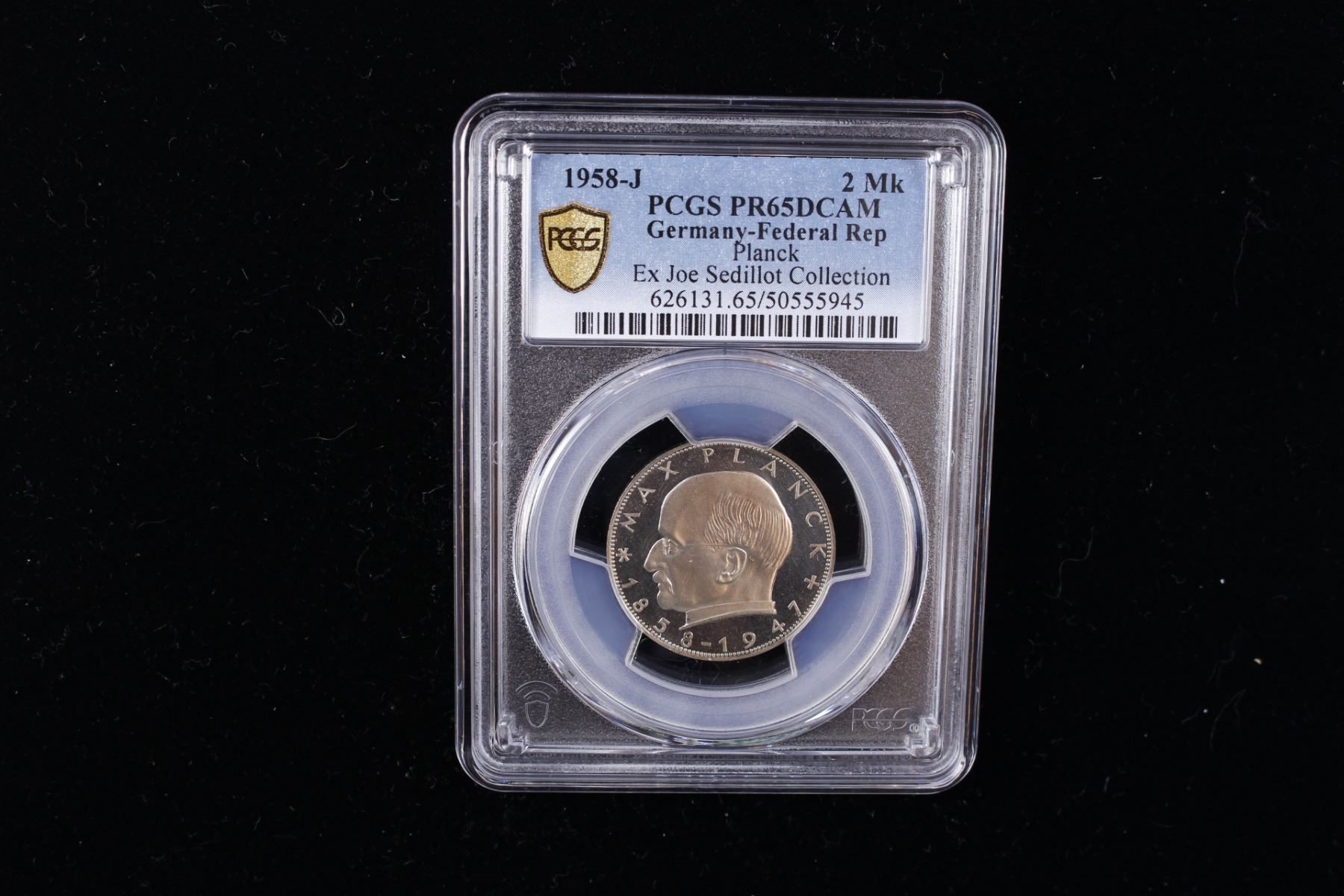 GERMANY: Federal Republic, 2 deutsche mark, 1958-J, KM-116, J-392, Max Planck, a superb proof quality example! PCGS graded Proof 65 DCAM, ex Joe Sedillot Collection. Max Karl Ernst Ludwig Planck (1858-1947) was a German theoretical physicist whose discovery of energy quanta won him the Nobel Prize in Physics in 1918.