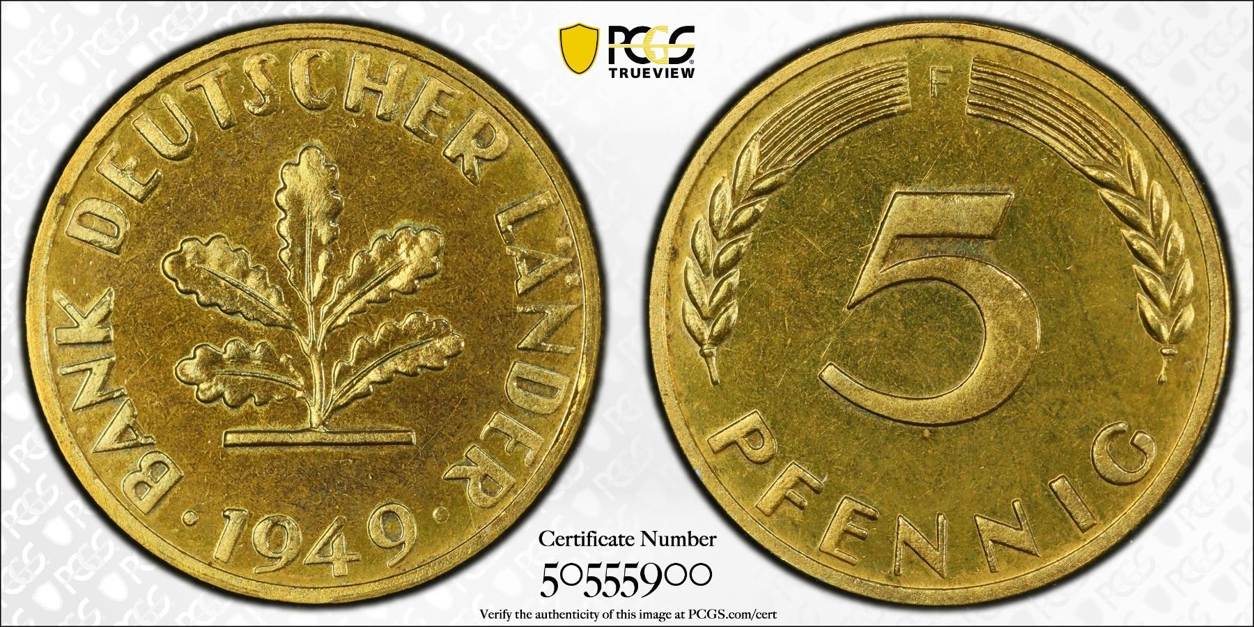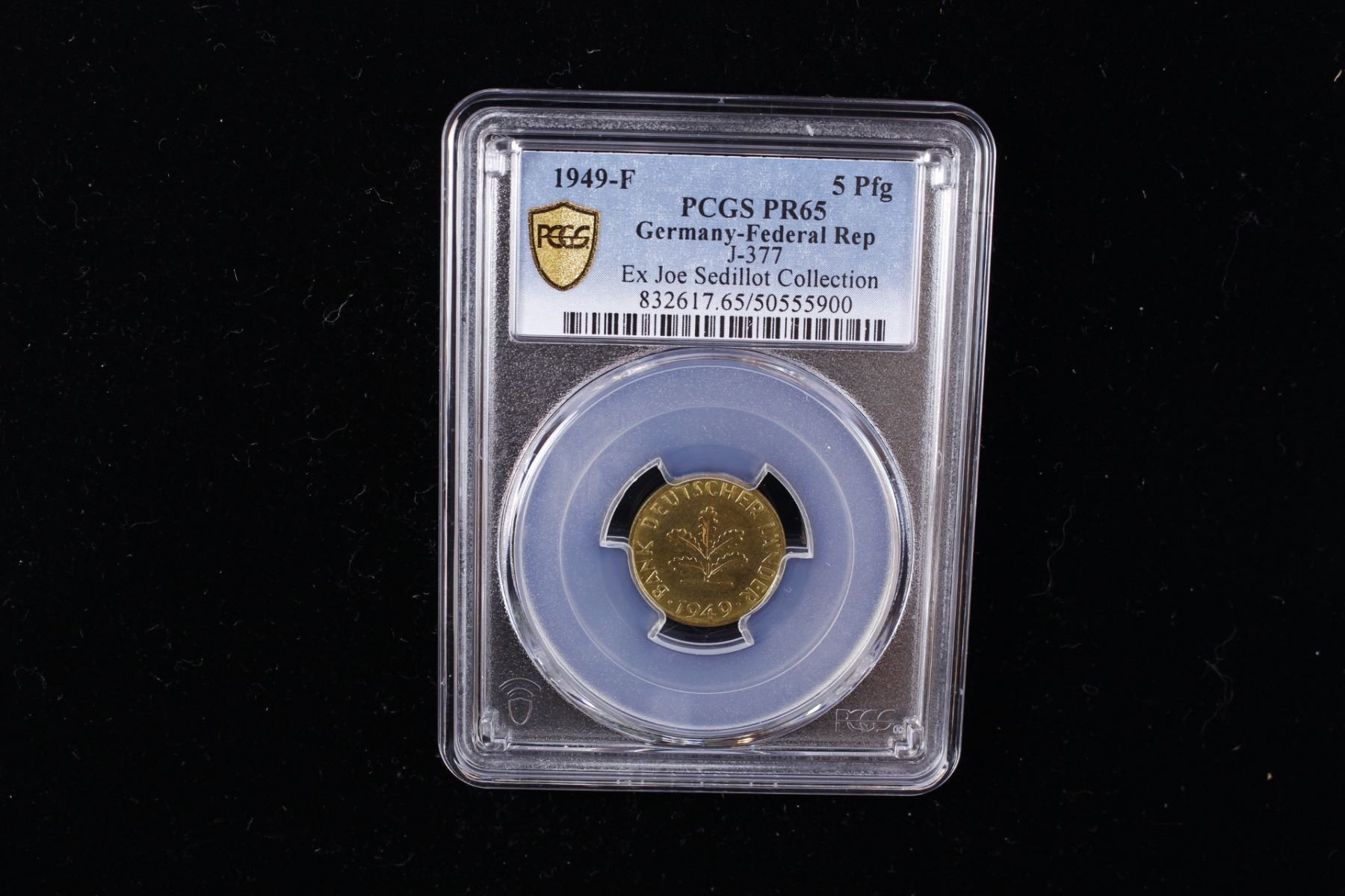 GERMANY: Federal Republic, 5 pfennig, 1949-F, KM-102, J- 377, a superb proof quality example! PCGS graded Proof 65, ex Joe Sedillot Collection.