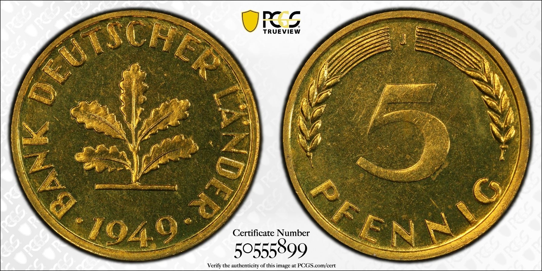 GERMANY: Federal Republic, 5 pfennig, 1949-J, KM-102, J- 377, a superb proof quality example! PCGS graded Proof 65, ex Joe Sedillot Collection.