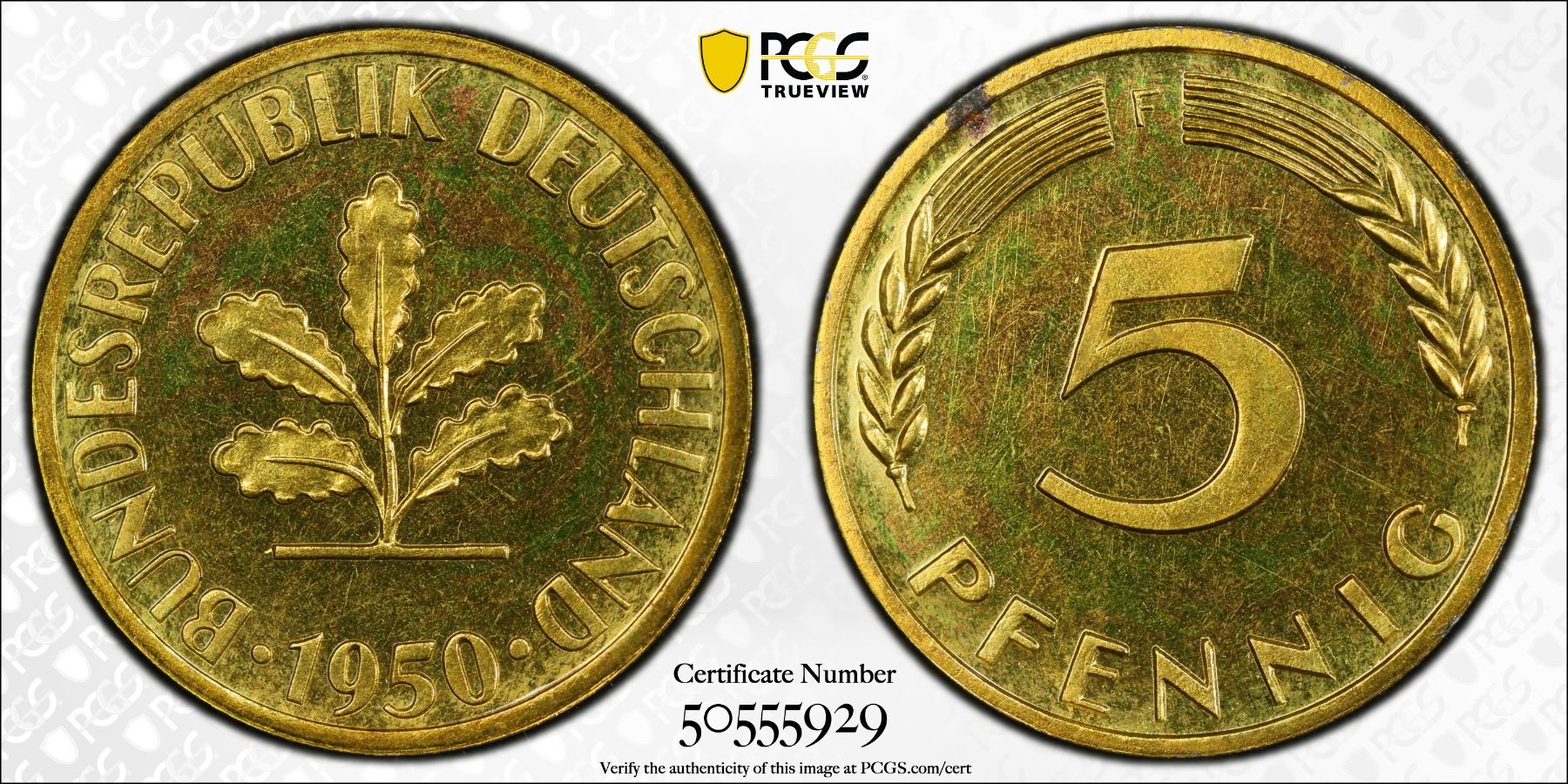 GERMANY: Federal Republic, 5 pfennig, 1950-F, KM-107, J-382, a wonderful proof quality example! PCGS graded Proof 64, ex Joe Sedillot Collection.