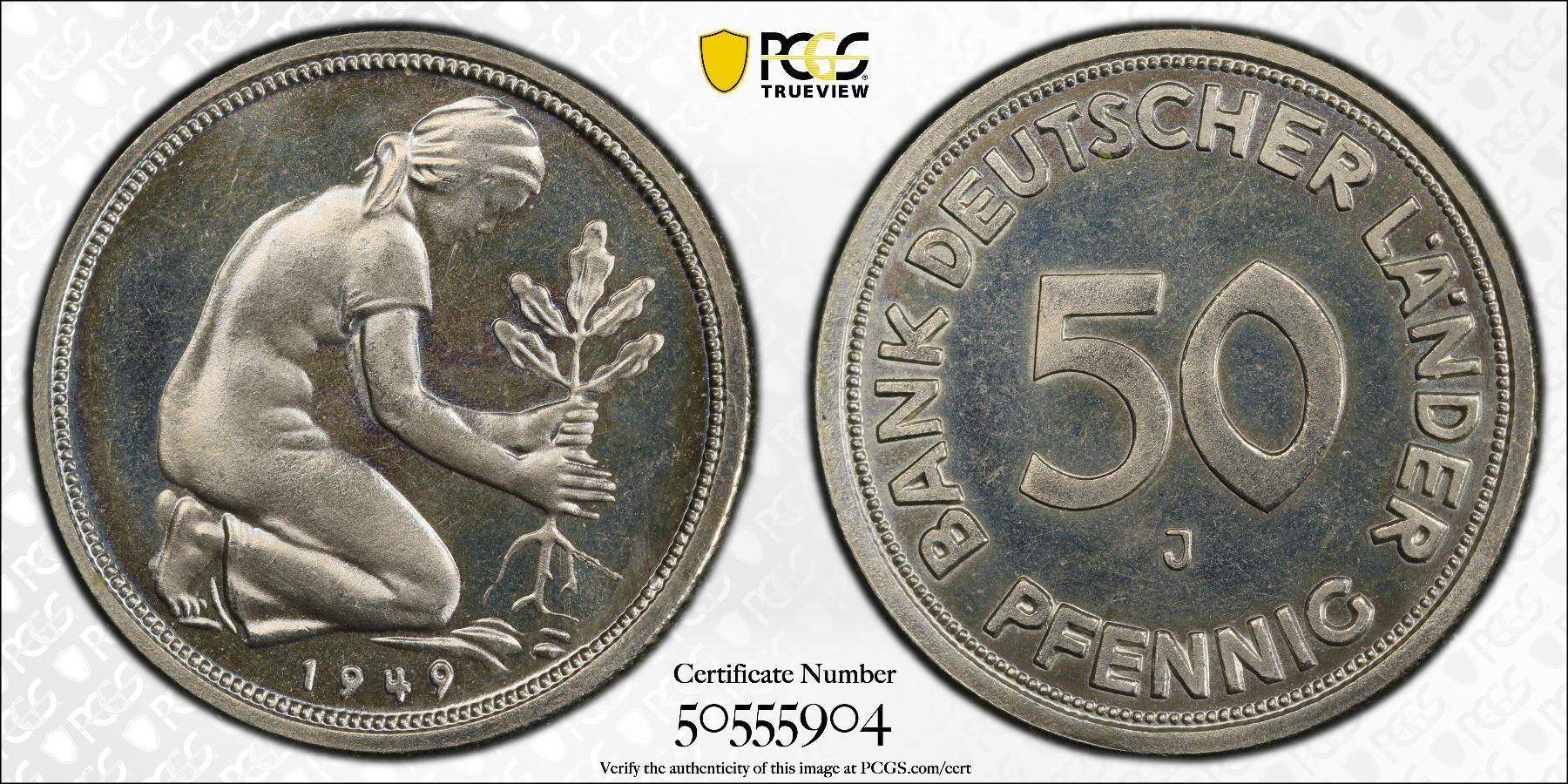GERMANY: Federal Republic, 50 pfennig, 1949-J, KM-104, J- 379, a superb proof quality example! PCGS graded Proof 65, ex Joe Sedillot Collection.