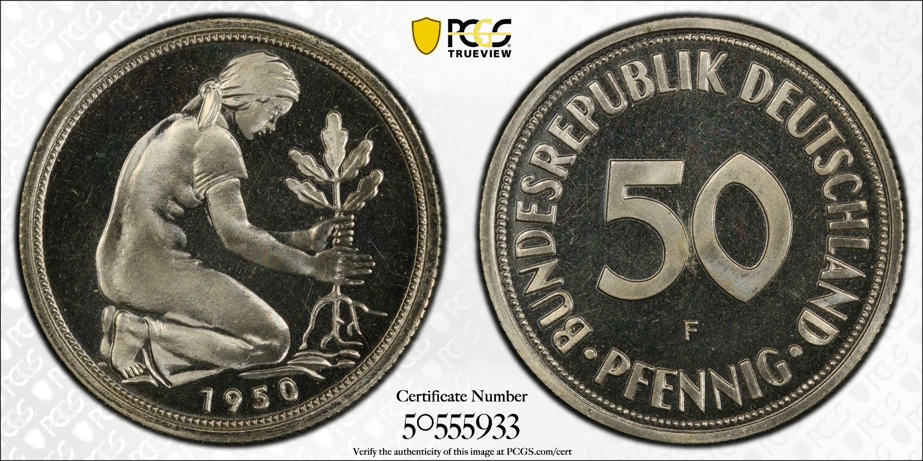 GERMANY: Federal Republic, 50 pfennig, 1950-F, KM-109.1, J-384, a fantastic proof quality example! PCGS graded Proof 66 CAM, ex Joe Sedillot Collection.