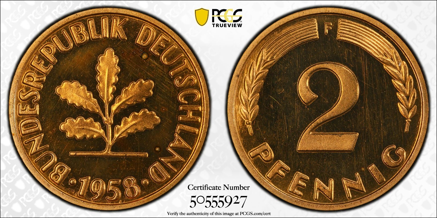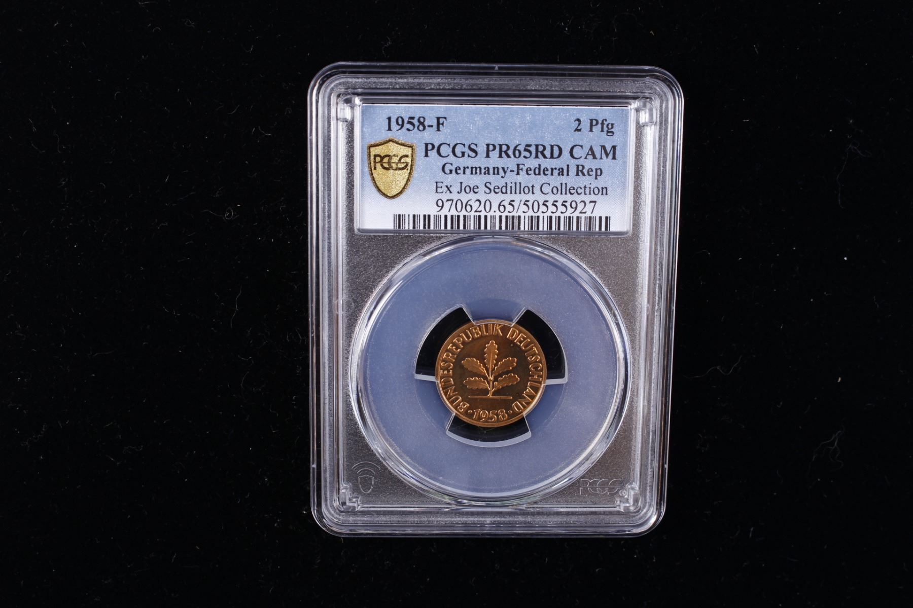 GERMANY: Federal Republic, AE 2 pfennig, 1958-F, KM-106, J-381, a superb proof quality example! PCGS graded Proof 65 RD CAM, ex Joe Sedillot Collection.