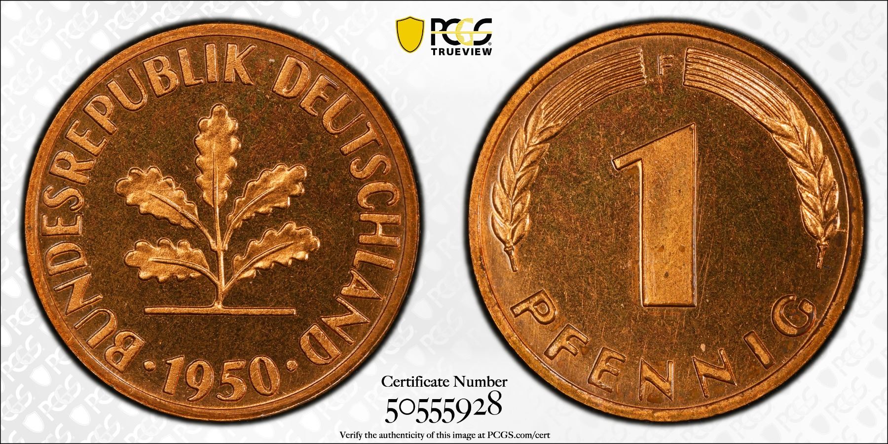 GERMANY: Federal Republic, AE pfennig, 1950-F, KM-105, J-380, a superb proof quality example! PCGS graded Proof 65 RD CAM, ex Joe Sedillot Collection.