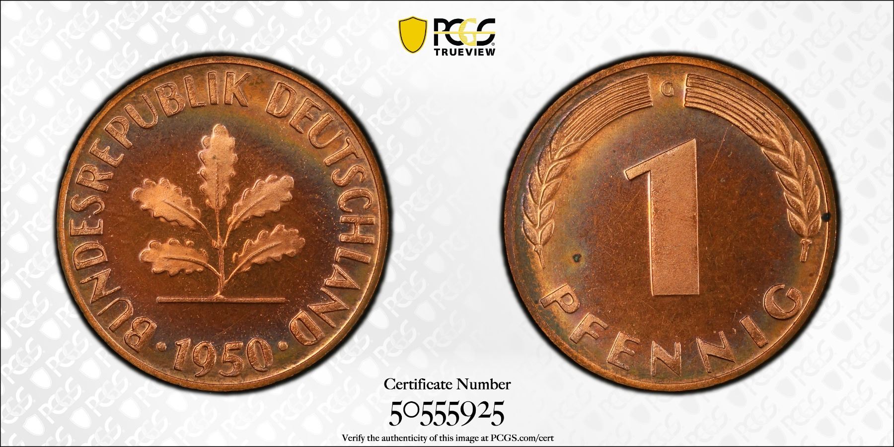 GERMANY: Federal Republic, AE pfennig, 1950-G, KM-105, J-380, a superb proof quality example! PCGS graded Proof 65 RD CAM, ex Joe Sedillot Collection.