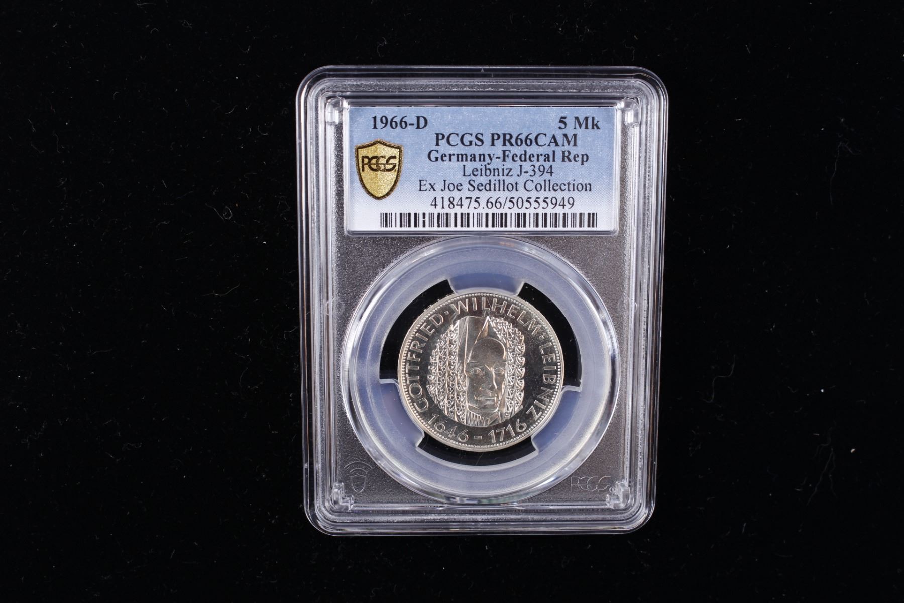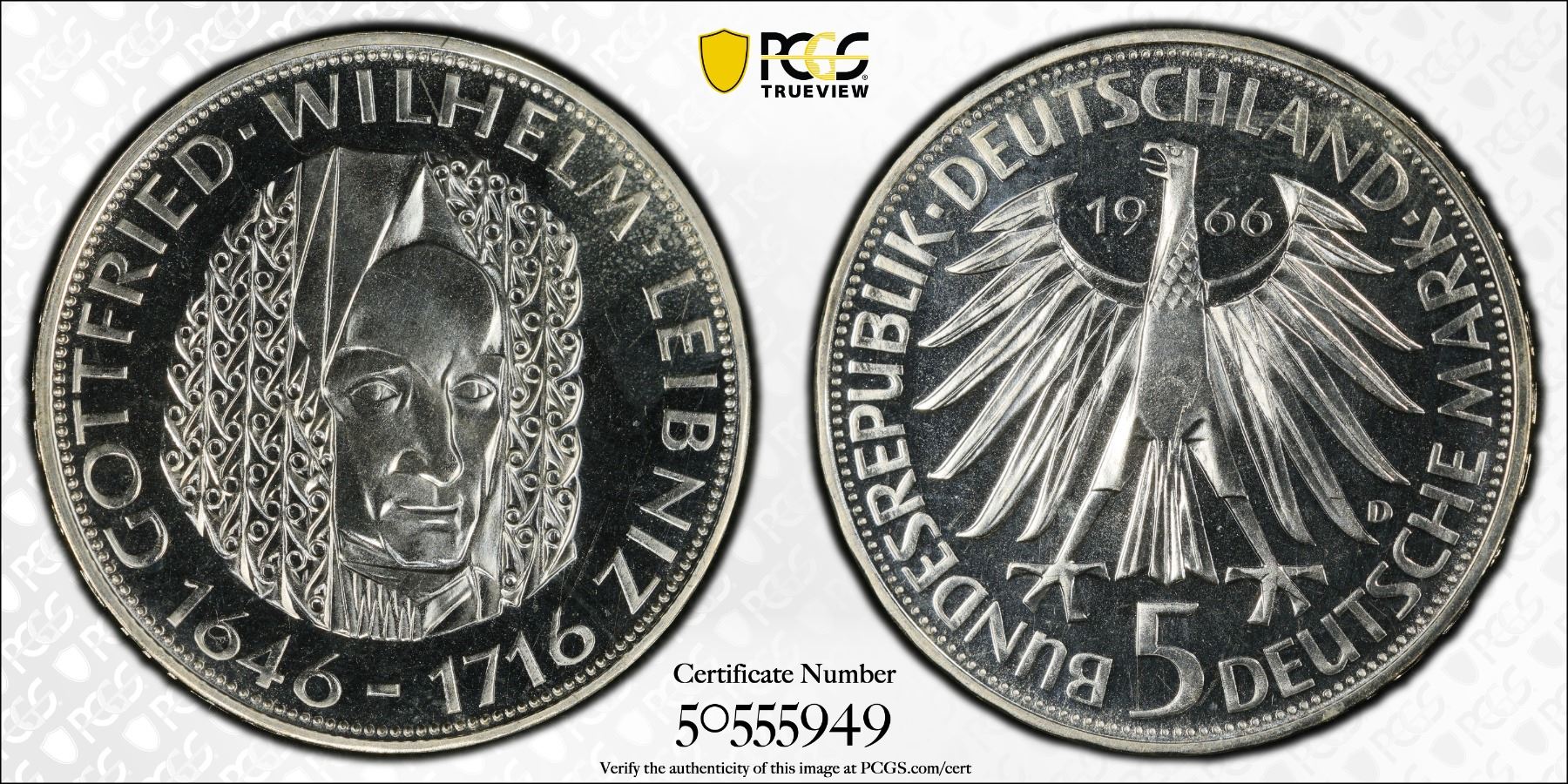 GERMANY: Federal Republic, AR 5 deutsche mark, 1966-D, KM-119.1, J-394, 250th Anniversary - Death of Wilhelm Leibniz, a fantastic proof quality example! PCGS graded Proof 66 CAM, ex Joe Sedillot Collection. Gottfried Wilhelm Leibniz (1646-1716) was a German polymath active as a mathematician, philosopher, scientist and diplomat who is credited, alongside Sir Isaac Newton, with the creation of calculus in addition to many other branches of mathematics, such as binary arithmetic and statistics. Leibniz has been called the "last universal genius" due to his vast expertise across fields.