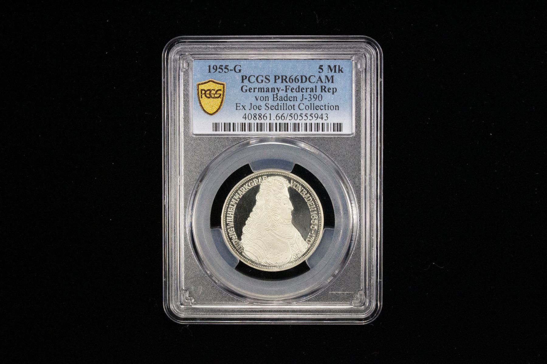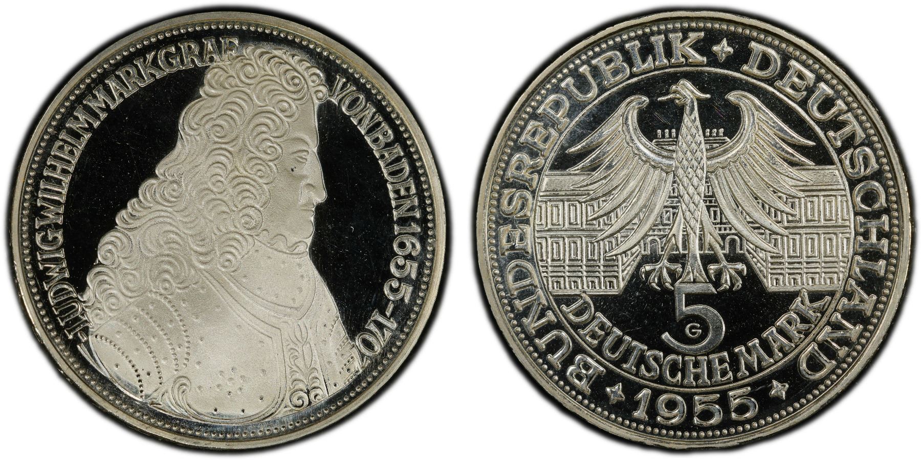 GERMANY: Federal Republic, AR 5 deutsche mark, Karlsruhe, 1955-G, KM-115, J-390, 300th Anniversary - Birth of Ludwig Wilhelm Markgraf von Baden, a fantastic proof quality example! PCGS graded Proof 66 DCAM, ex Joe Sedillot Collection. Ludwig Wilhelm, Margrave of Baden-Baden (1655-1707) was the chief commander of the Imperial army and Reichsgeneralfeldmarschall of the Holy Roman Empire. He was also known as Türkenlouis ("Turkish Louis") for his numerous victories against Ottoman forces.