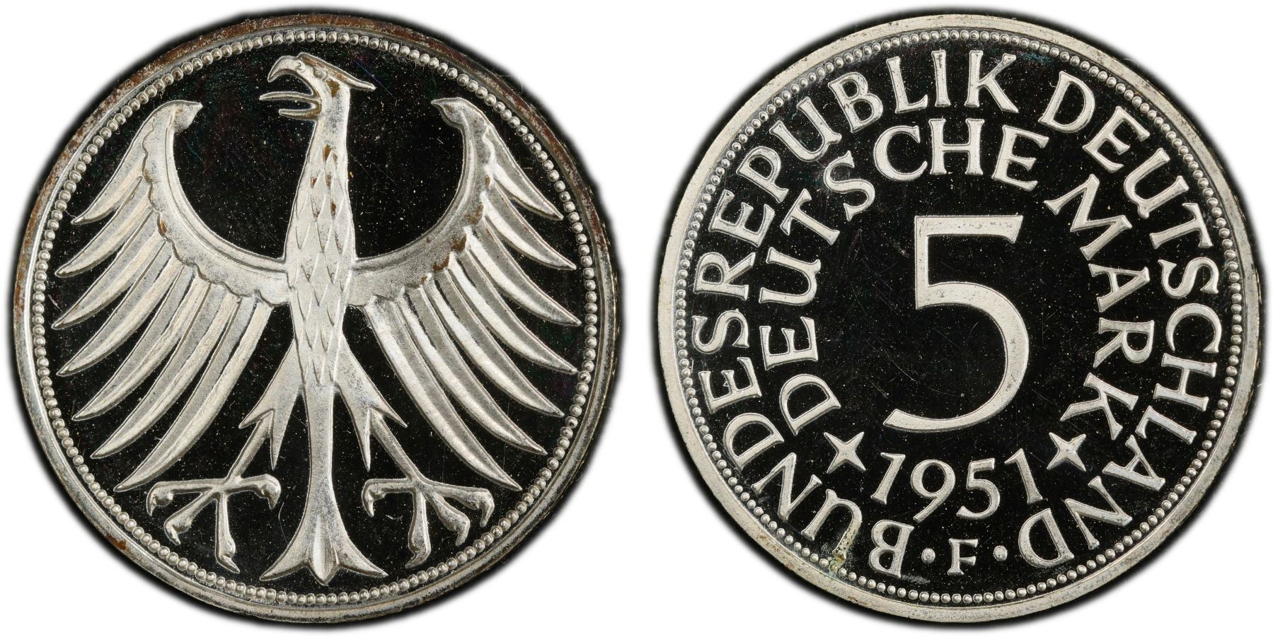 GERMANY: Federal Republic, AR 5 deutsche mark, Stuttgart, 1951-F, PCGS Proof 67 DCAM