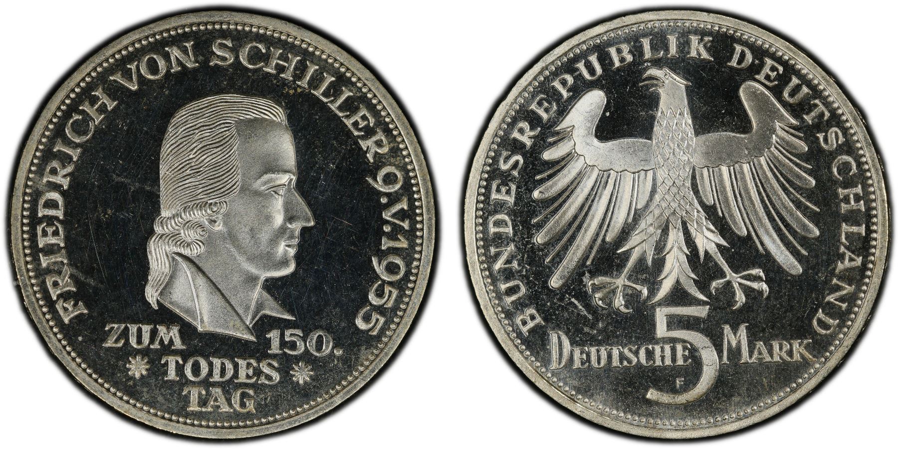 GERMANY: Federal Republic, AR 5 deutsche mark, Stuttgart, 1955-F, KM-114, J-389, 150th Anniversary - Death of Friedrich von Schiller, a wonderful proof quality example! PCGS graded Proof 64 CAM, ex Joe Sedillot Collection. Johann Christoph Friedrich von Schiller (1759-1805) was a German playwright, poet, philosopher and historian. Schiller is considered by most Germans to be Germany's most important classical playwright.